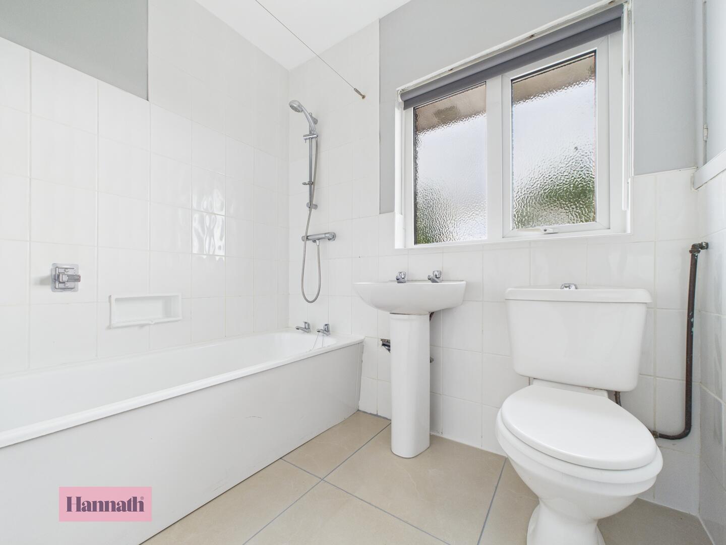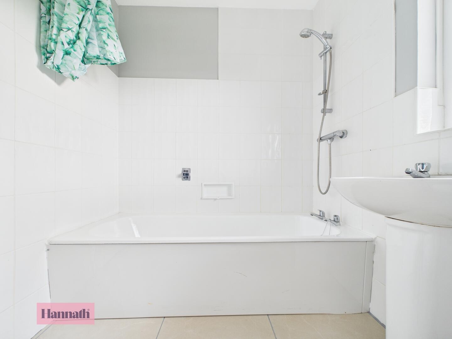 Three piece suite, bath with shower over, wash hand basin, w.c., part tiled walls, radiator, tiled floor
