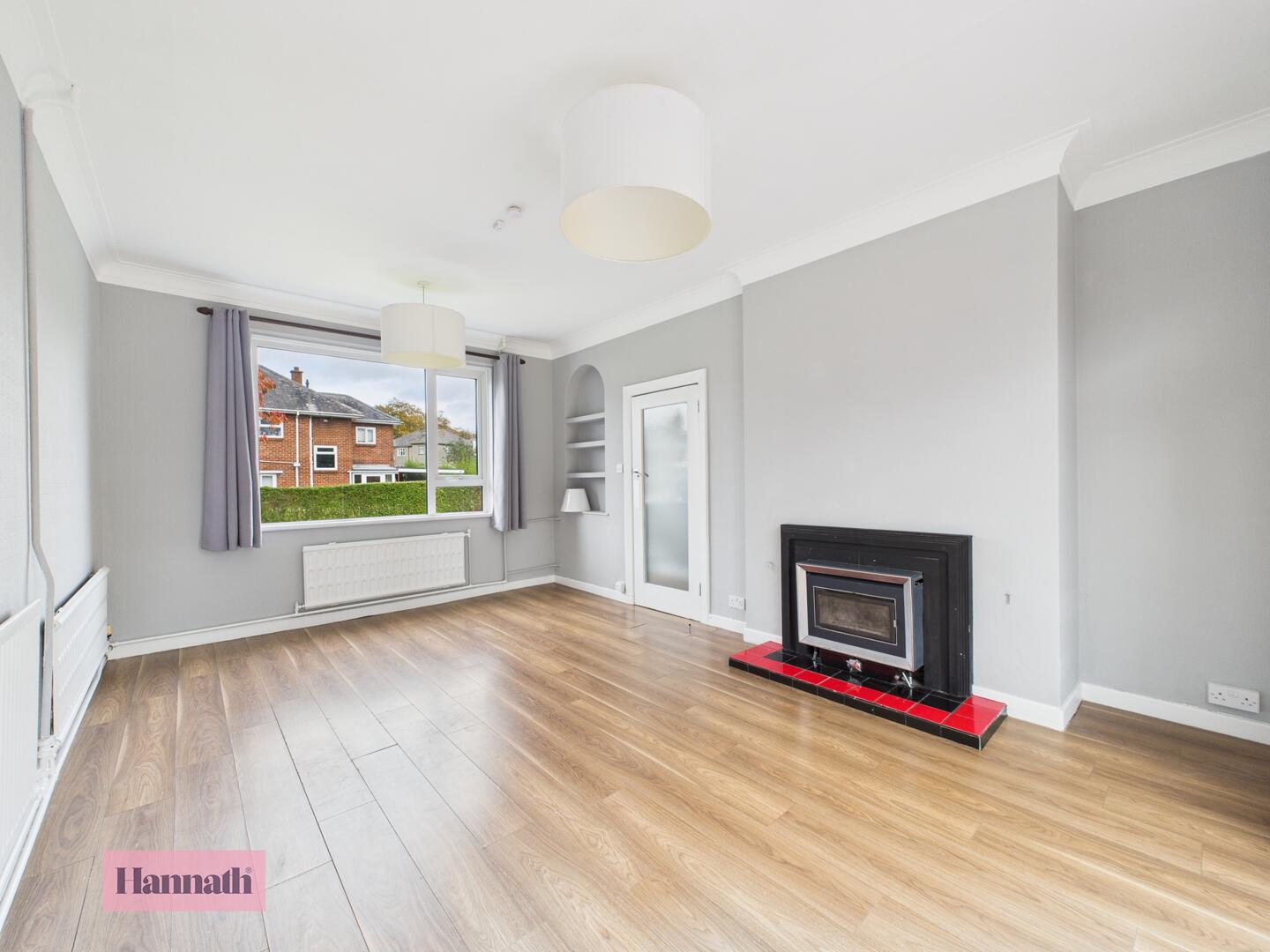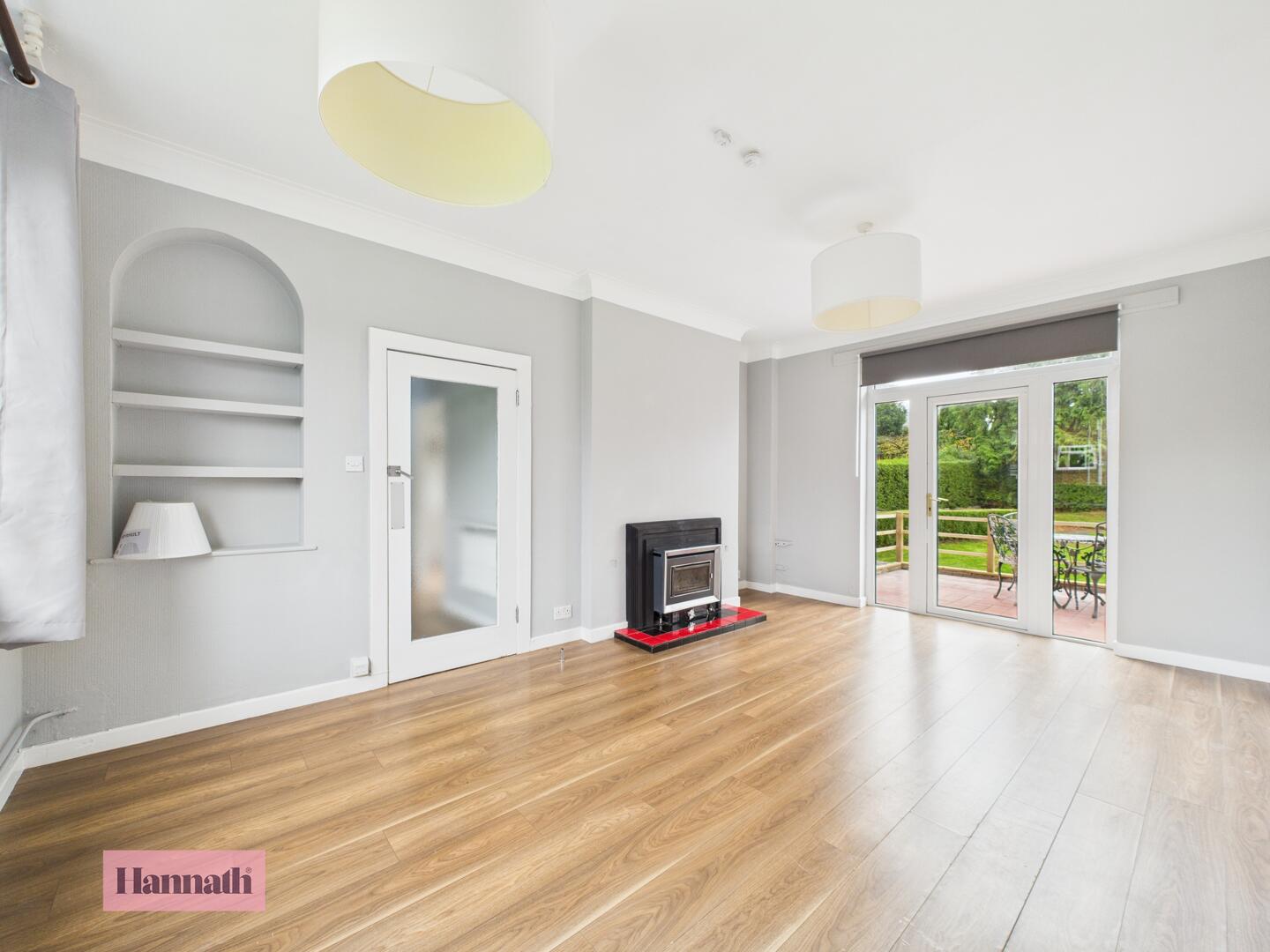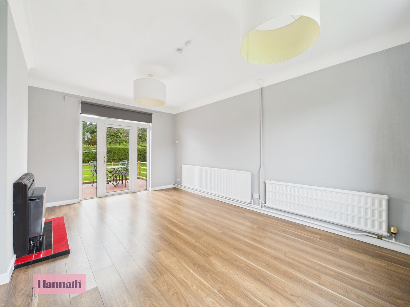 Wood laminate flooring, radiators, back door to rear patio area, feature fireplace/stove