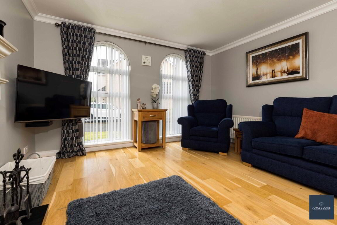 Front aspect reception room with feature double arch windows. Coving. Open fireplace with Marble surround, granite back panel and hearth. Solid wood flooring. TV point. Double panel radiator.