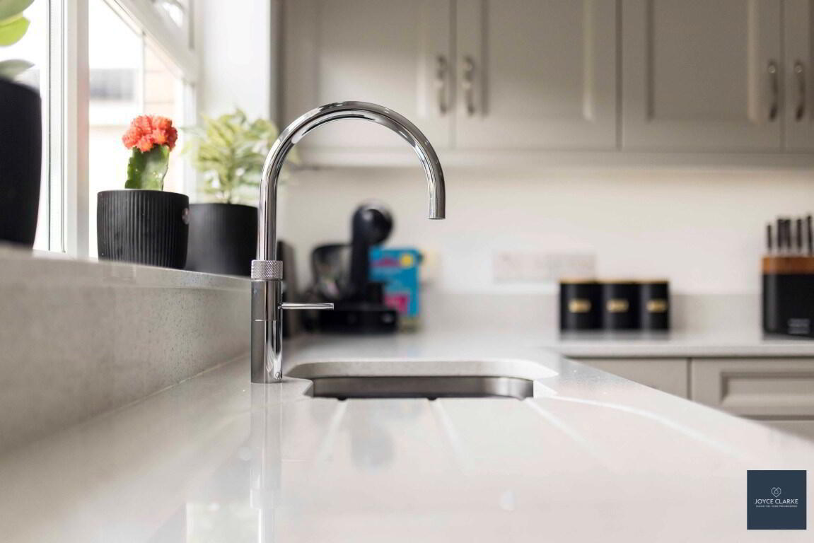 Excellent range of high and low level kitchen cabinets with solid wood doors including larder style unit, saucepan drawers, microwave cupboard and integrated pull-out bin storage. Range of appliances include Stanley range cooker with five ring gas hob, grill and double oven, integrated fridge and dishwasher. Stainless steel one and half bowl underfitted sink with Quooker tap and pelmet above with recessed lighting. Island unit with seating area. Quartz worktops, upstands and splashback to cooker area. Tiled flooring and skirting. Recessed lighting. Double panel radiator. UPVC door with glazed panels giving access to rear.