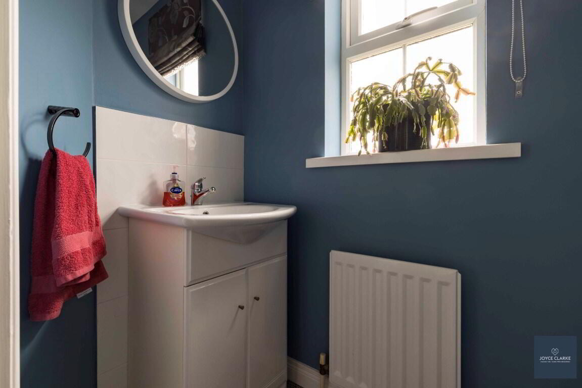 Dual flush WC and wash hand basin with vanity unit below. Single panel radiator. Tiled flooring and splashback to sink area.