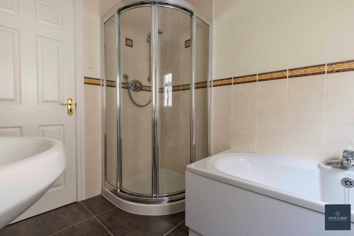 Four piece bathroom suite comprising of panel bath with centre taps dual flush WC, wash hand basin and separate shower quadrant with mains fed shower. Heated towel rail. Extractor fan. Half tiled walls and flooring tiling.