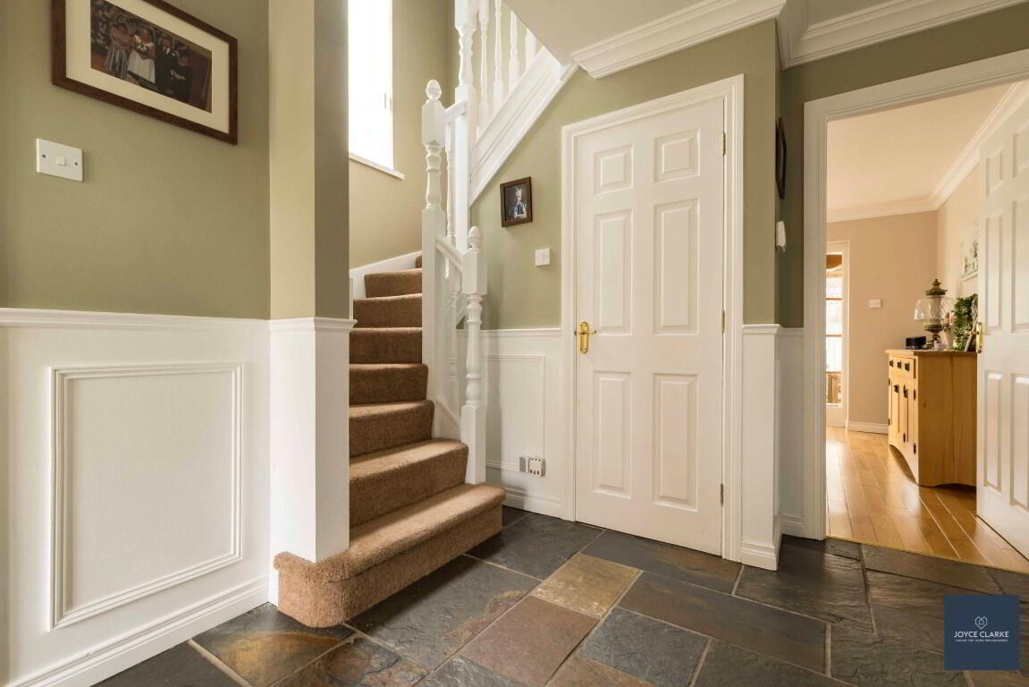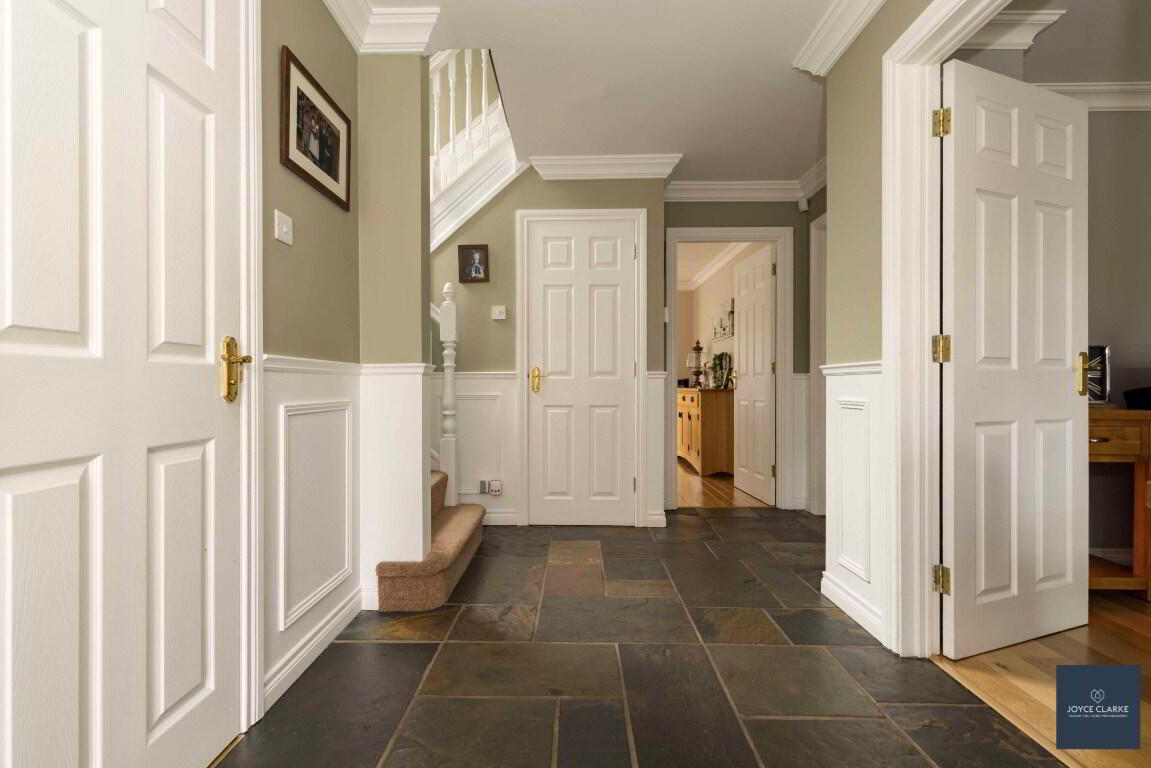 ENTRANCE HALLUPVC framed entrance door with glazed panels and glazed panels to either side. Cloakroom. Storage closet. Feature panelling to walls. Chinese slate tiled flooring. Alarm panel. Coving. Double panel radiator