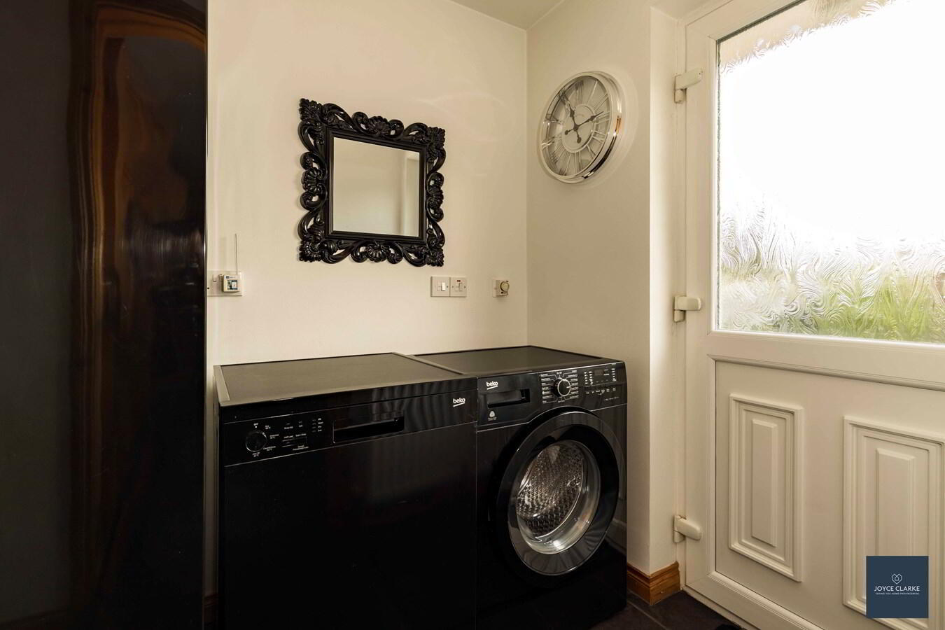 Space for American style fridge freezer, washing machine and tumble dryer. Single panel radiator. Tiled flooring. UPVC door with glazed panel giving access to rear garden.