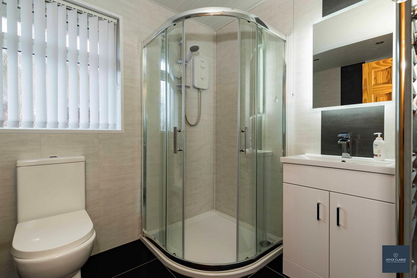 Shower enclosure with mains fed shower and tiled walls, dual flush WC and wash hand basin with vanity unit below. Tile effect PVC panelled walls. Heated towel rail. Recessed lighting. Extractor fan.