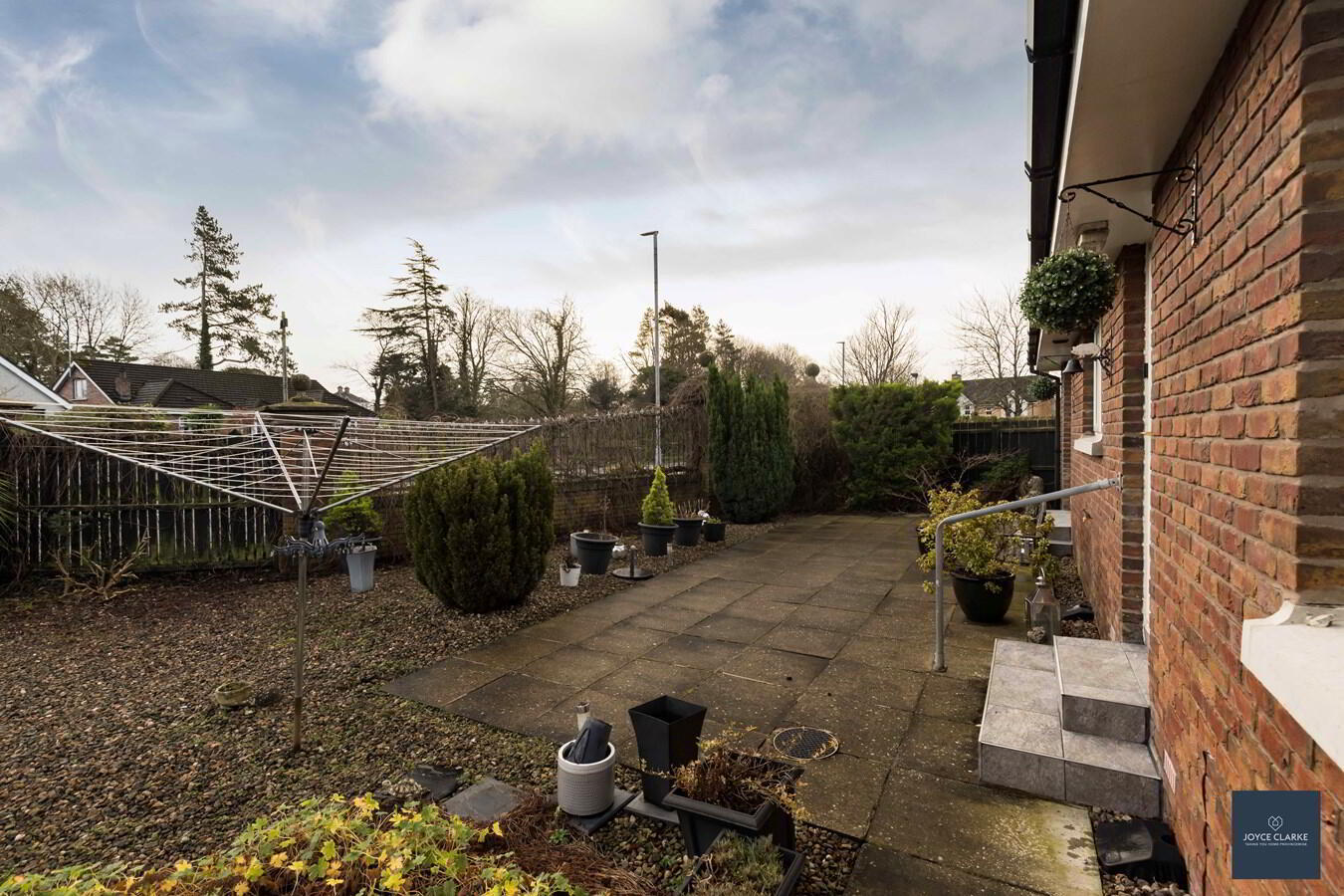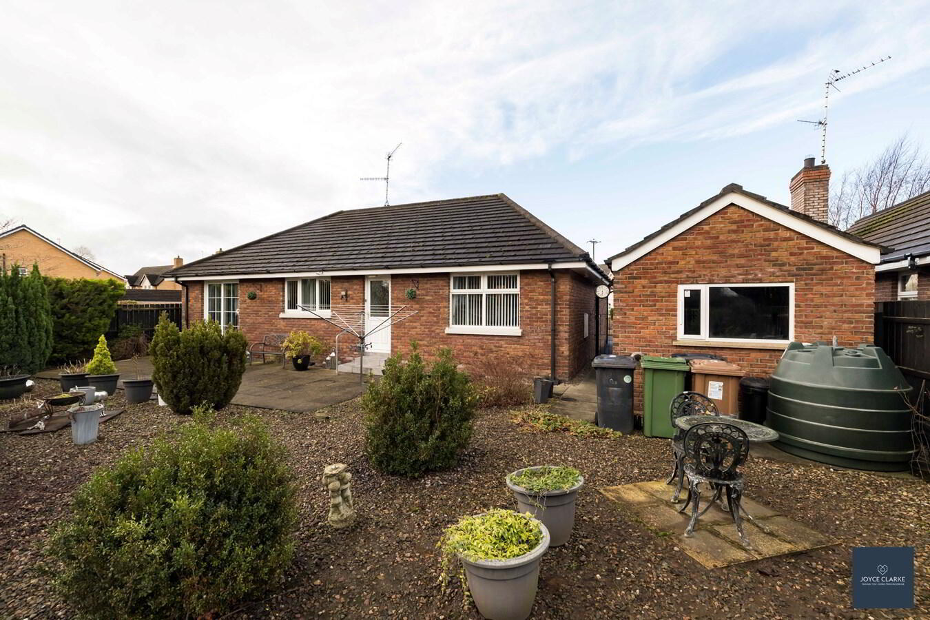 Fully enclosed rear garden with gated access to either side. Large paved patio area. Majority of garden laid in decorative stones. Oil tank. Outside tap and lighting.