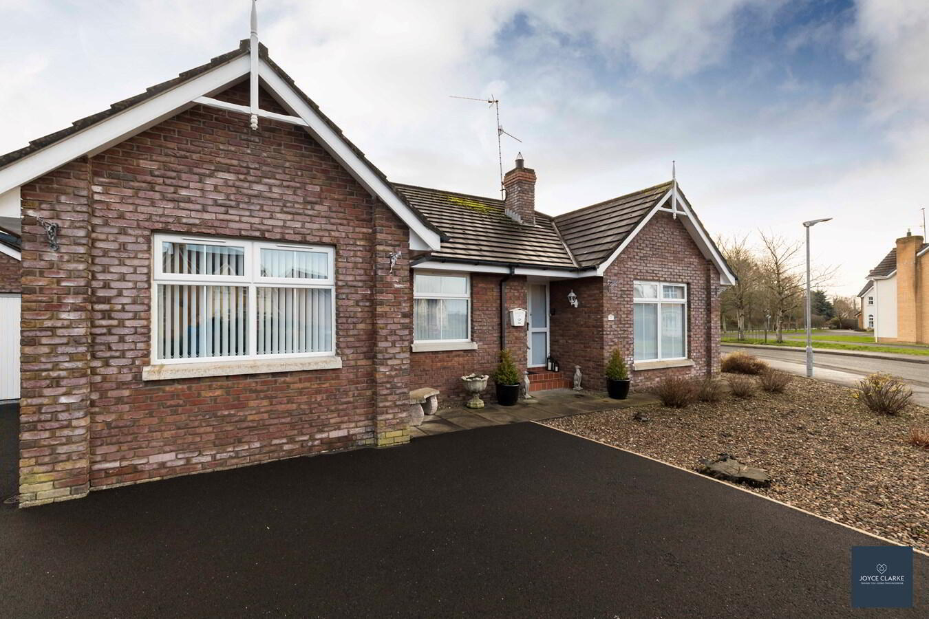 Spacious tarmac driveway approaching the property with parking to front and side. Front garden laid in decorative stone with mature planting.