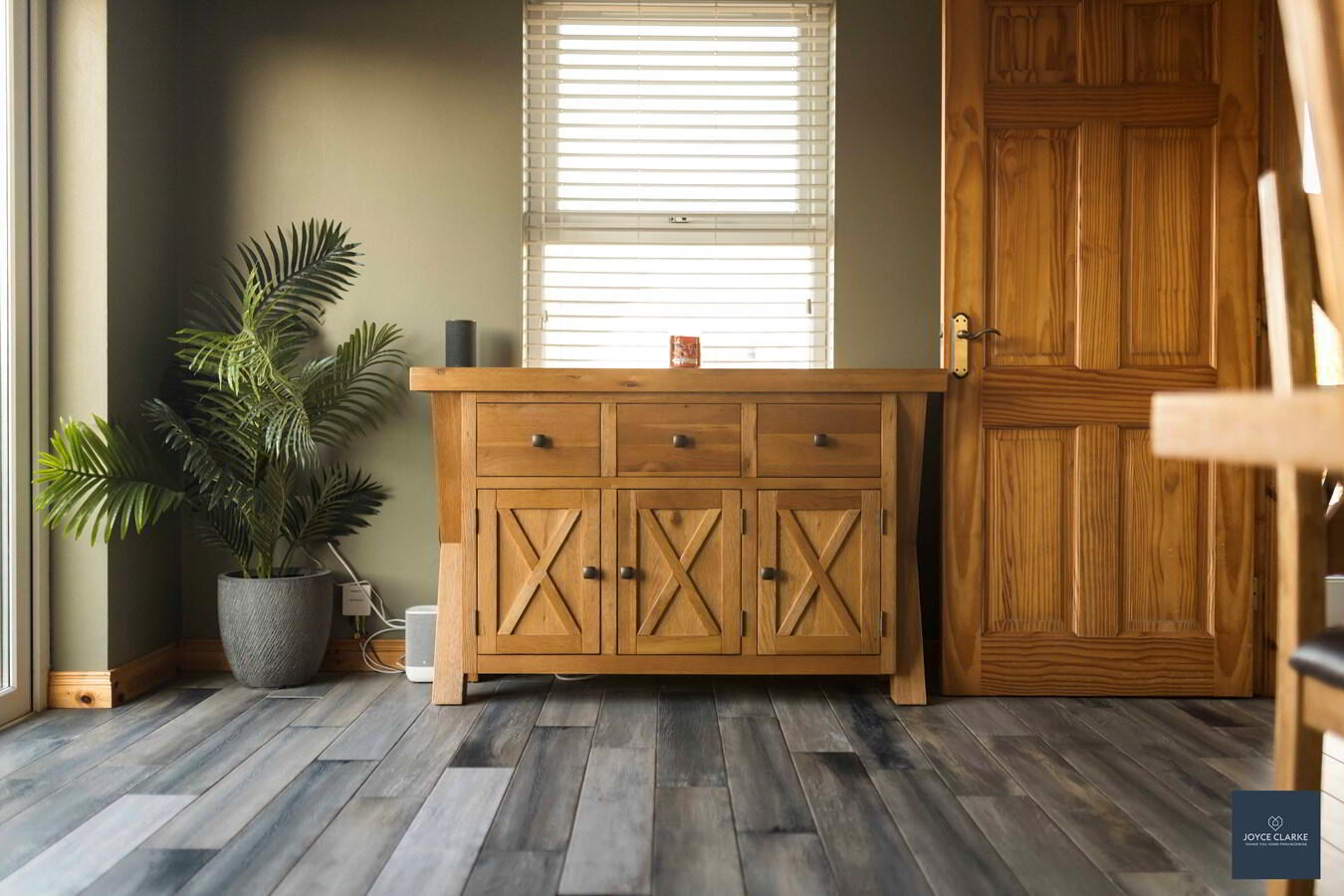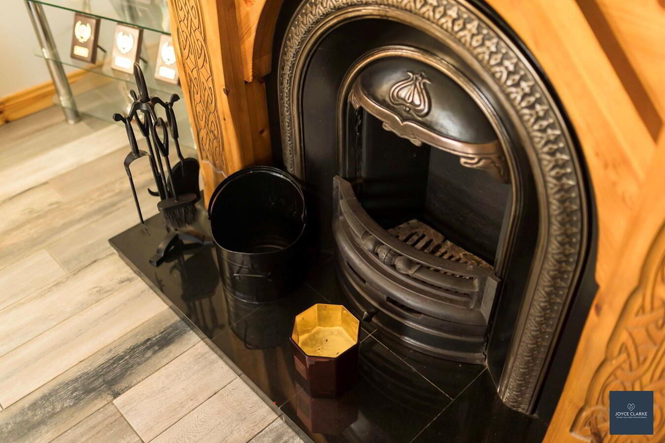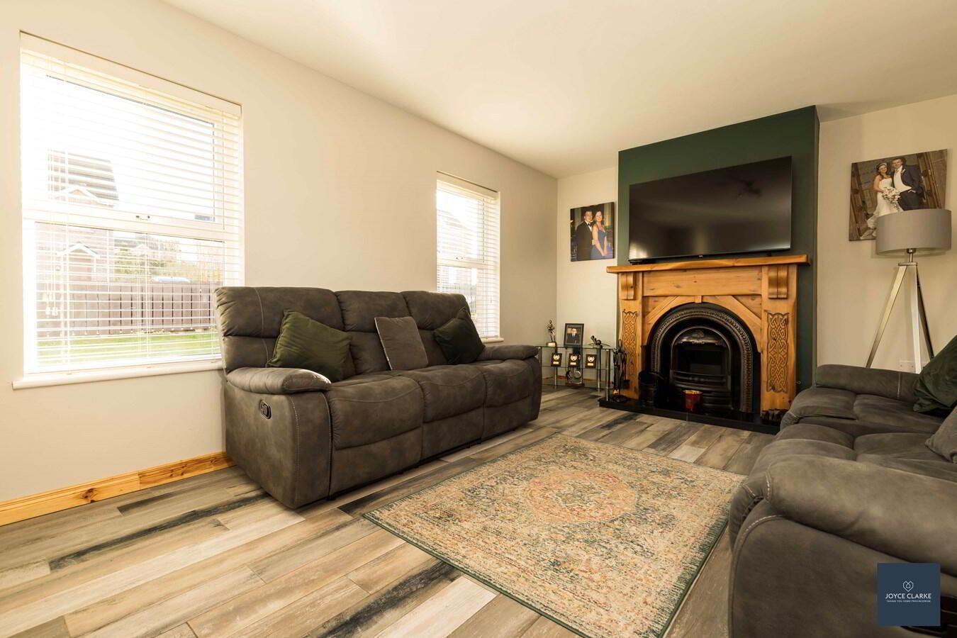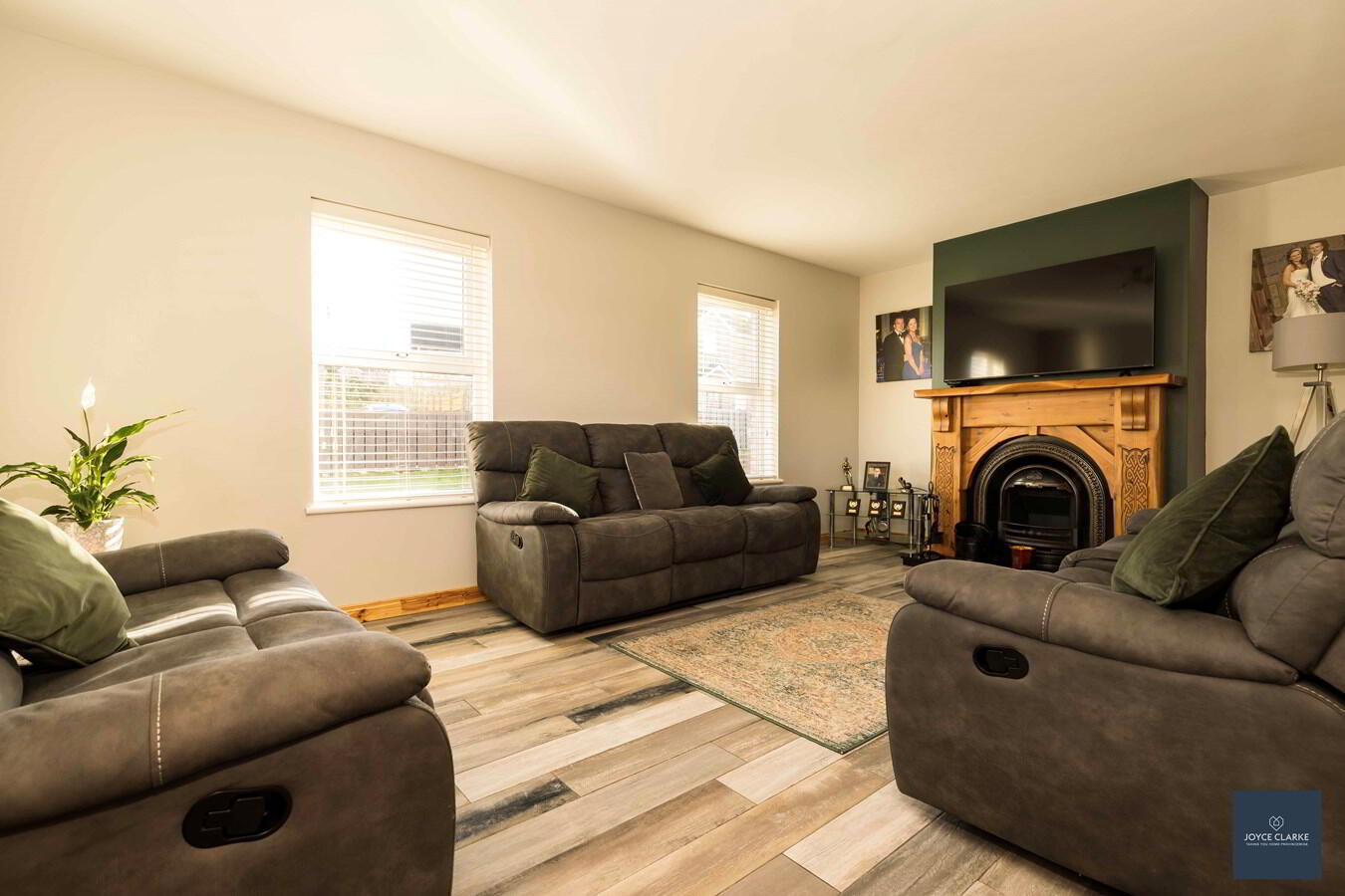 Dual aspect living room with feature fireplace, cast iron insert set upon tiled hearth. Wood effect tiled floor. Double panel radiator. TV point