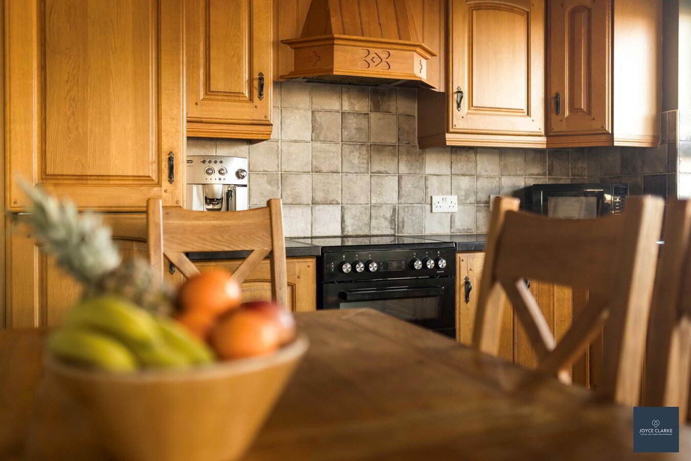Dual aspect room. Range of high and low level storage units with solid wood doors and glazed display cabinet. One and a half bowl stainless steel sink and drainer. Integrated fridge freezer and Normende dish washer. Space for washing machine and oven. Tiled splashback. Double panel radiator. Wood effect tiled floor. French doors to garden.