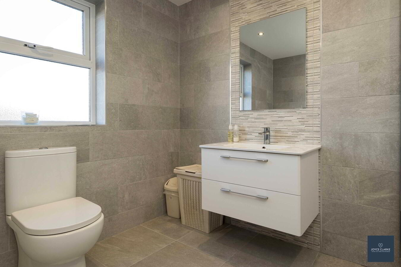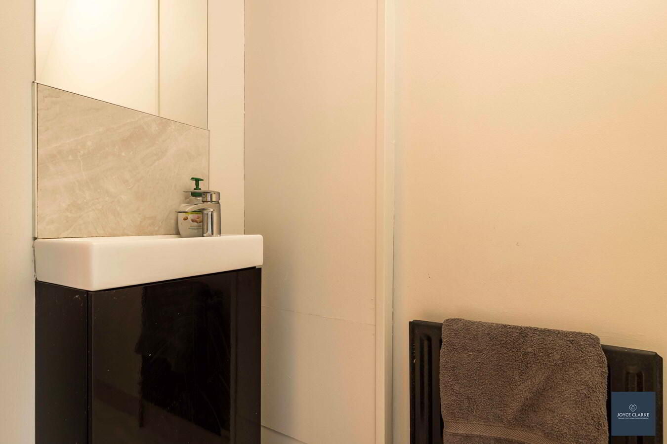 Sink with mixer tap and vanity unit below. Back to wall dual flush WC. Single panel radiator. Tiled floor and splashback. Extractor.