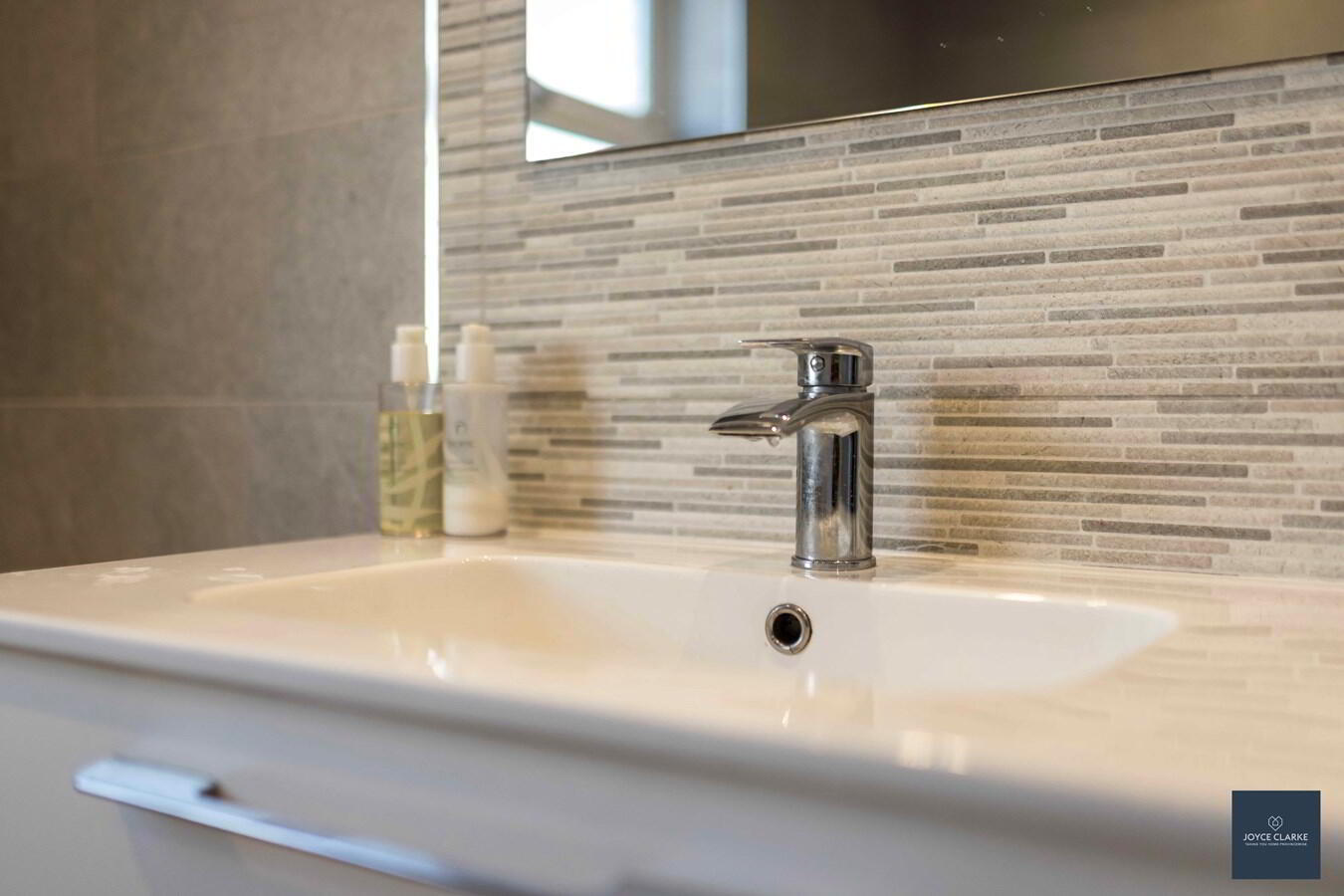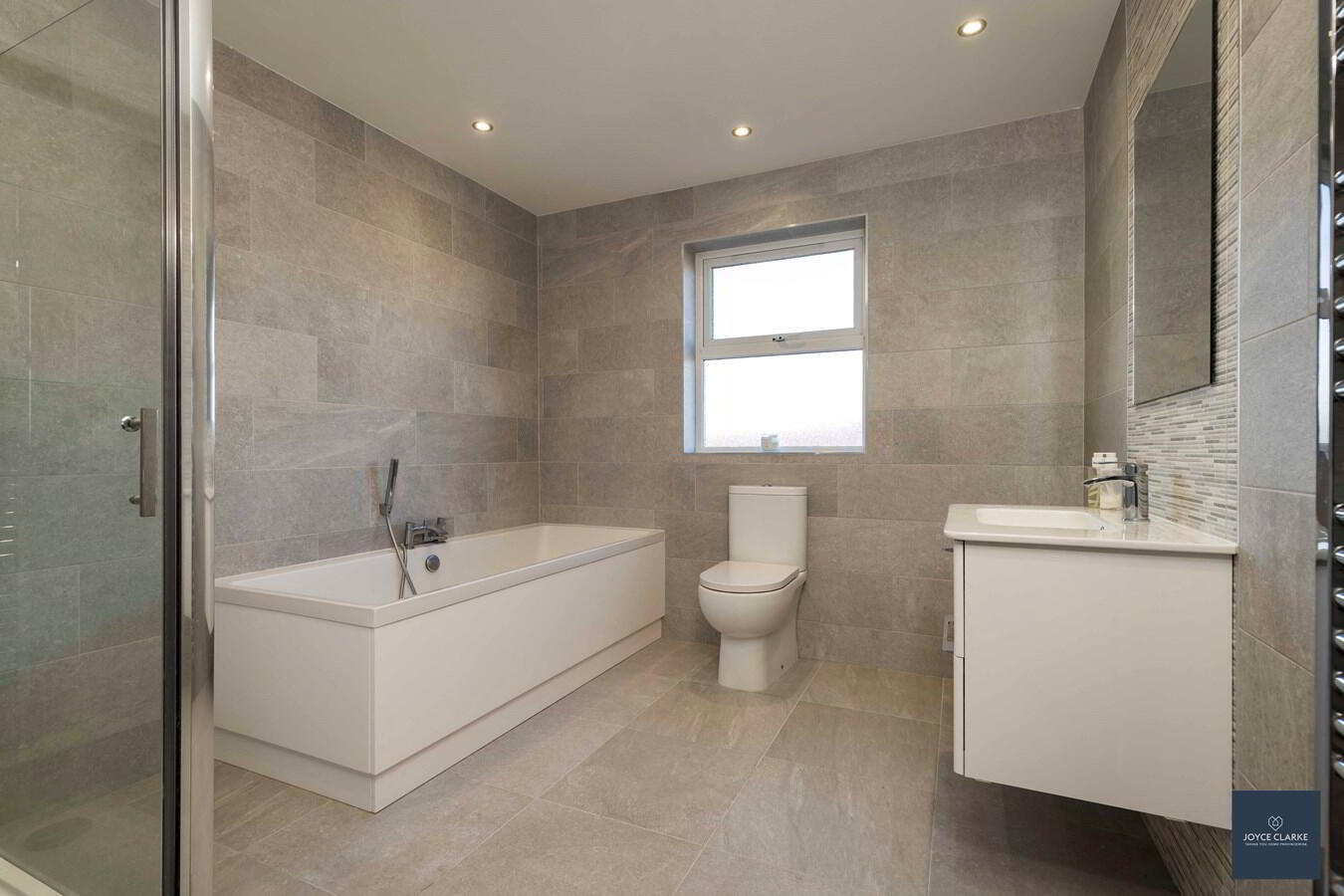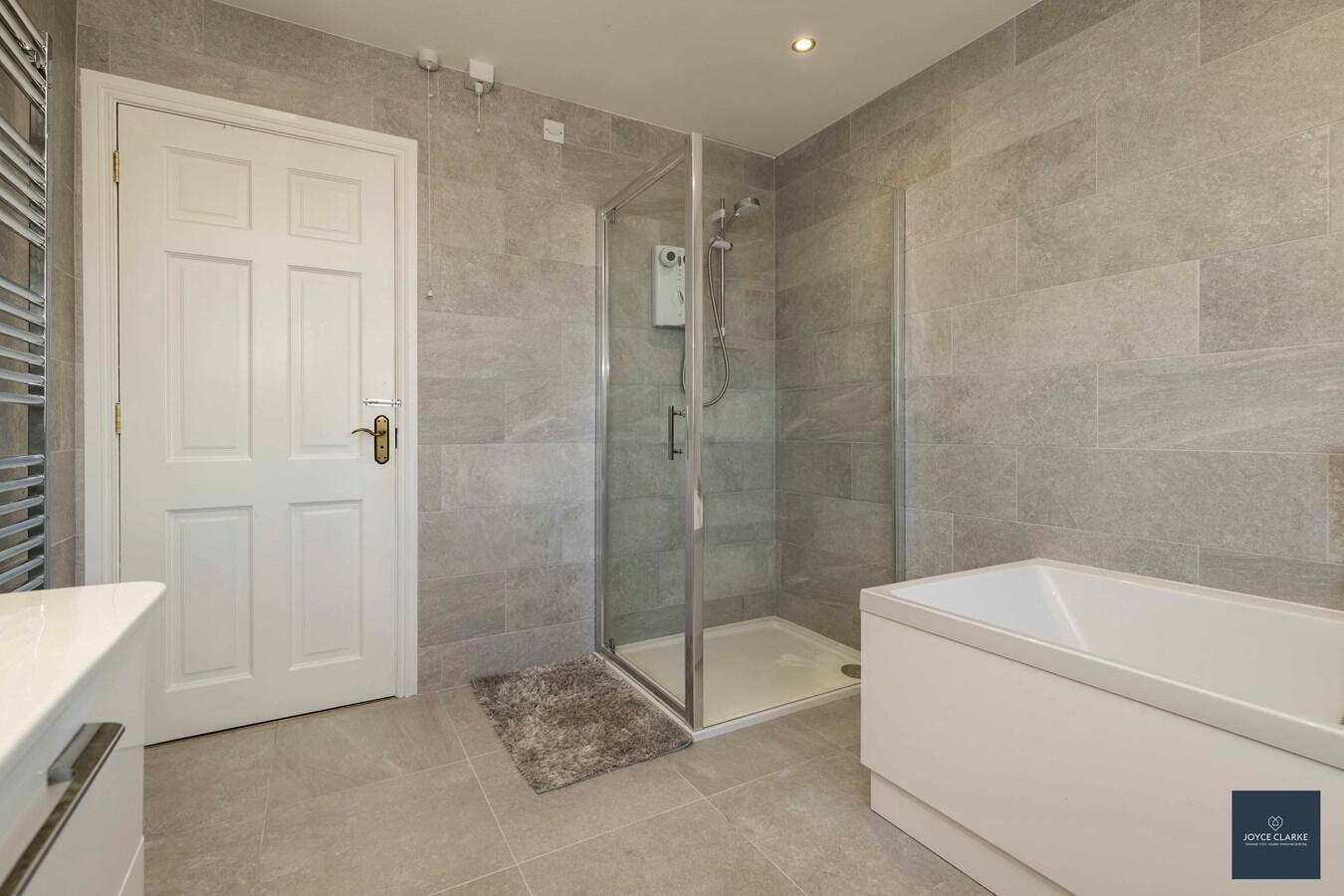 Modern fully tiled four piece suite. Comprising of corner shower enclosure with MIRA Sport electric shower. Moulded bath with centre mixer tap and shower attachment. Floating sink with mixer tap and vanity unit below. Back to wall dual flush WC. Heated towel rail. Recessed lighting.