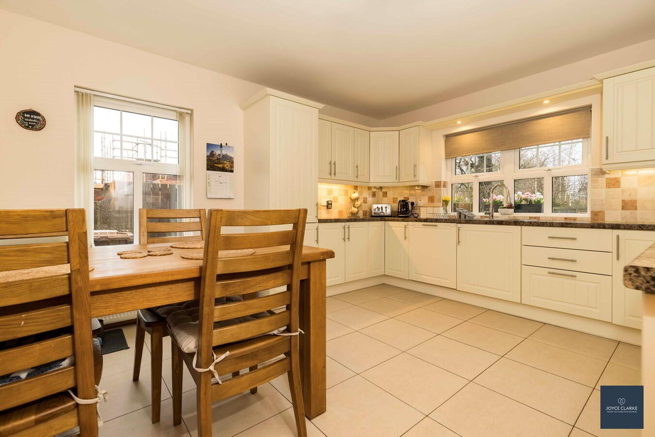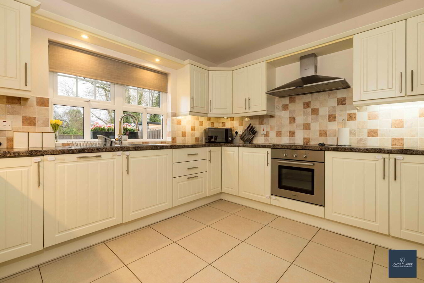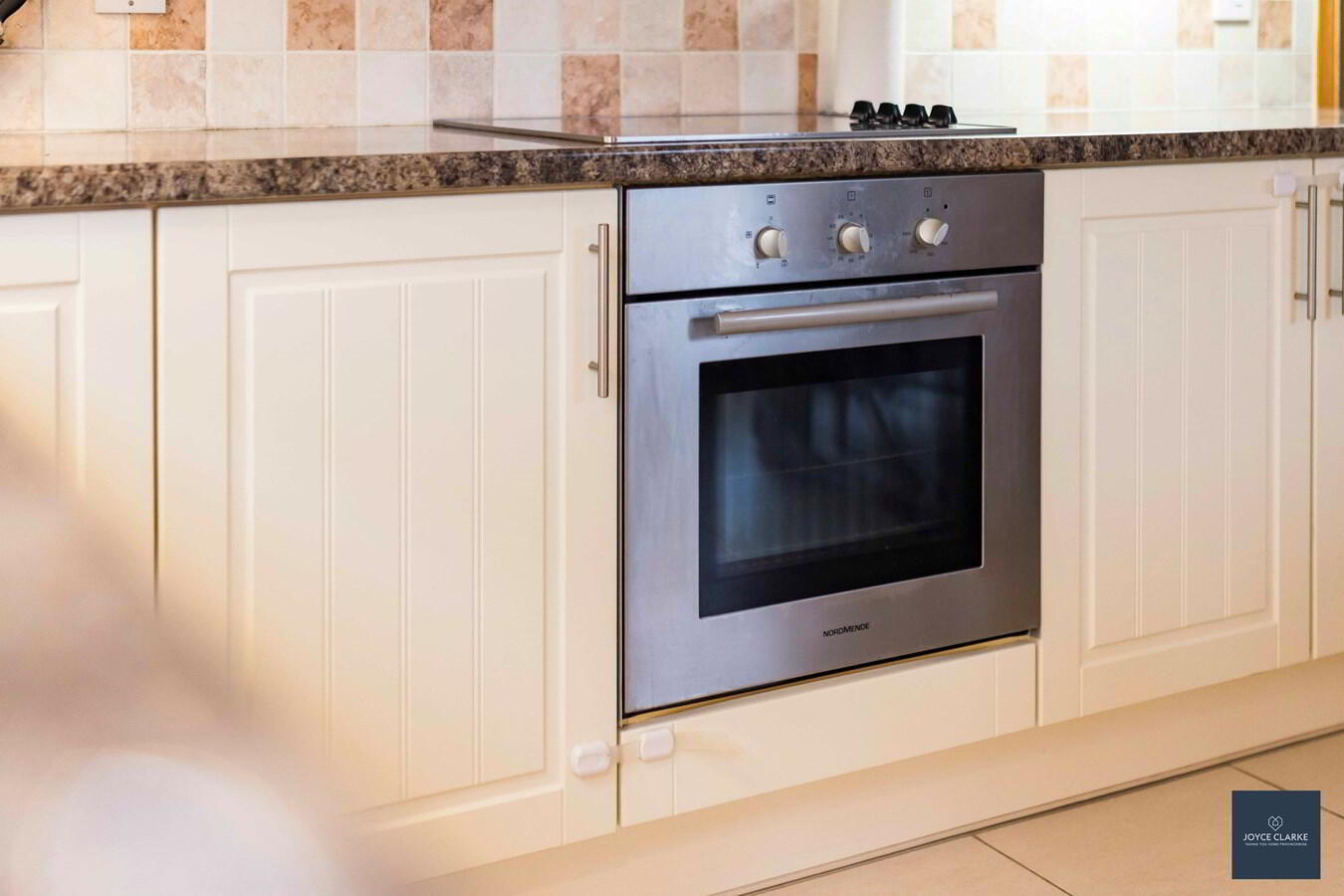 Dual aspect kitchen diner with excellent range of high and low level shaker style storage units. One and a half bowl stainless steel sink and drainer with mixer tap. Integrated oven and ceramic hob with stainless steel extractor above. Dish washer, fridge freezer. Tiled floor and part tiled walls. Double panel radiator.