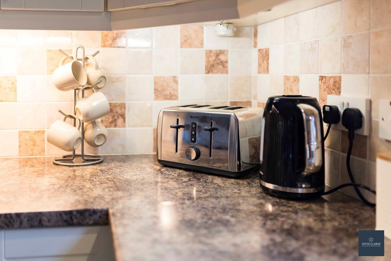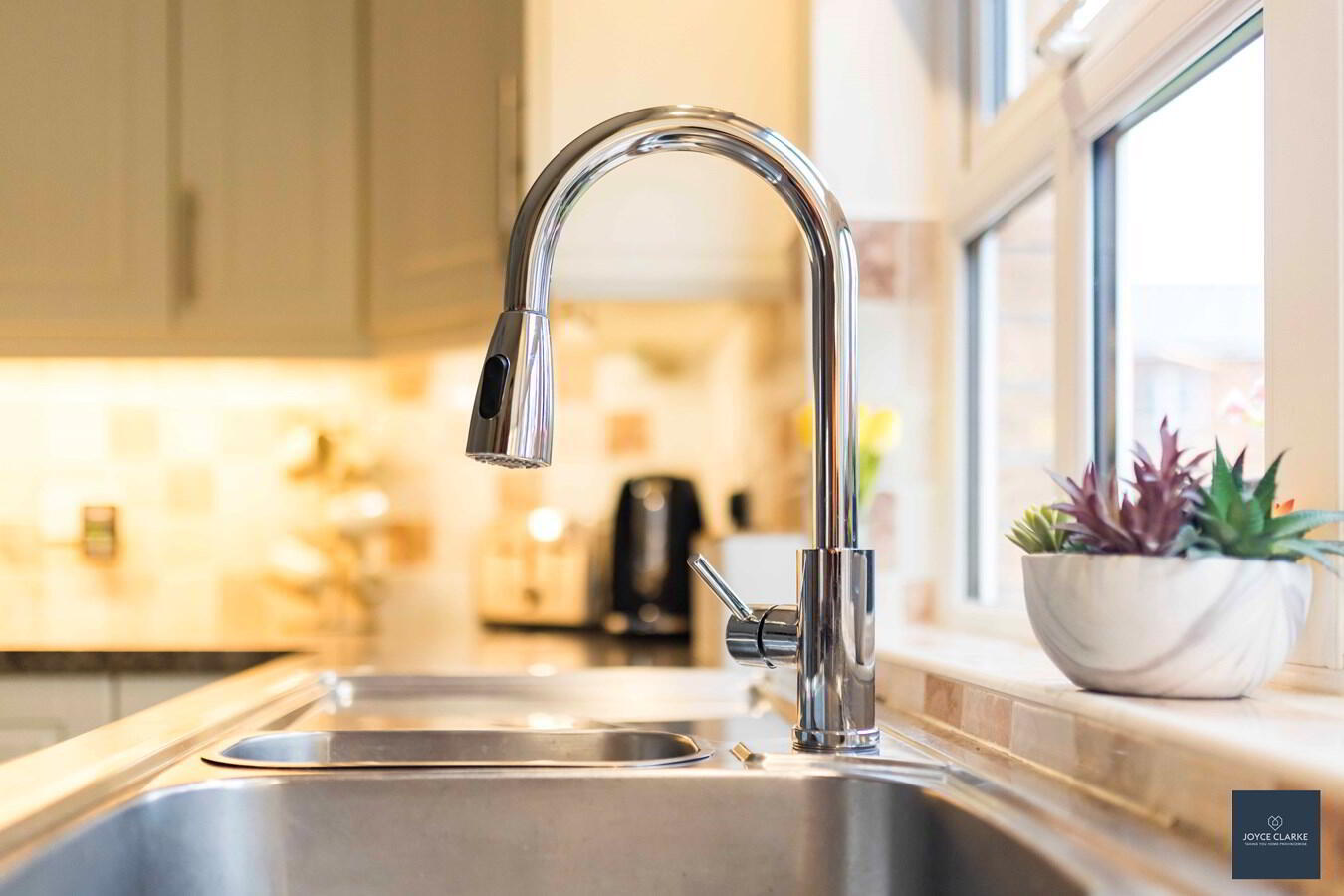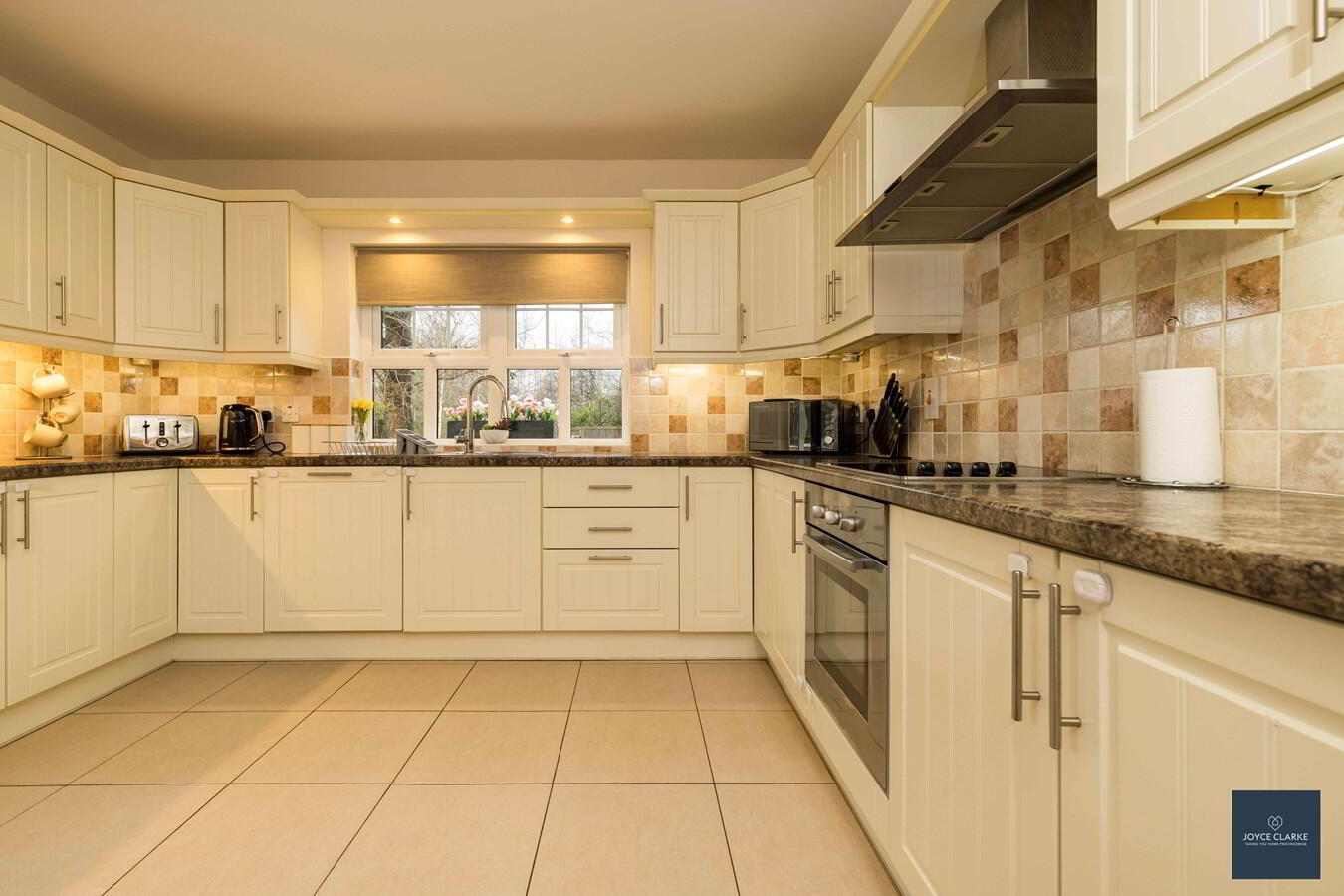 Dual aspect kitchen diner with excellent range of high and low level shaker style storage units. One and a half bowl stainless steel sink and drainer with mixer tap. Integrated oven and ceramic hob with stainless steel extractor above. Dish washer, fridge freezer. Tiled floor and part tiled walls. Double panel radiator.