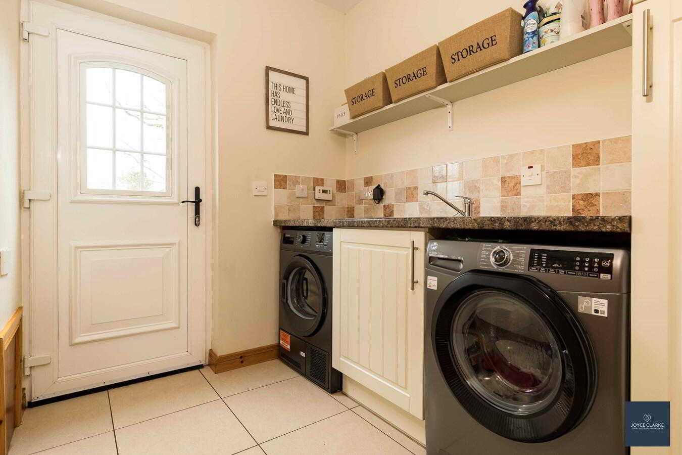 High and low level storage units. Stainless steel sink and drainer. Space for washing machine and tumble dryer. Double panel radiator. Tiled floor and splash back. Part glazed uPVC door to garden.