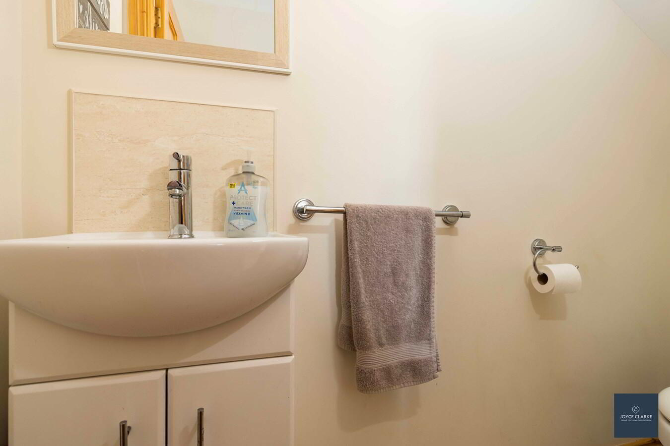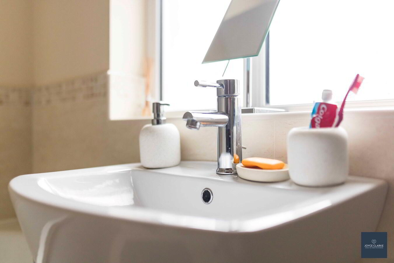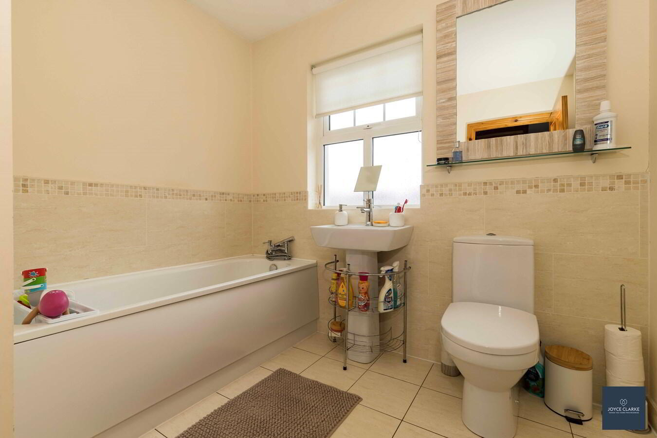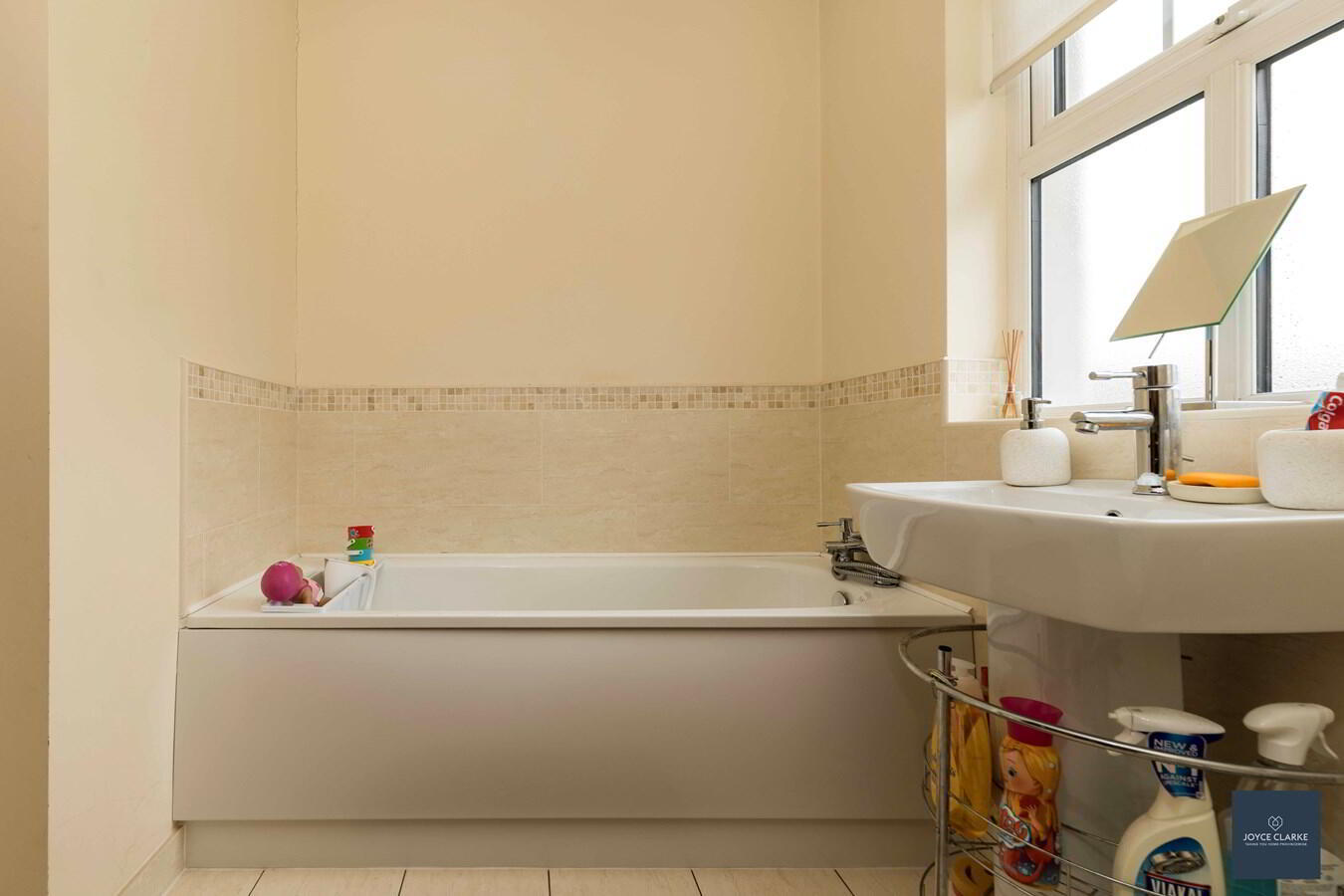 Three piece suite comprising of bath with mixer tap and shower attachment. Pedestal style sink with mixer tap. Back to wall dual flush WC. Heated towel rail. Tiled floor and part tiled walls. Window. Extractor.