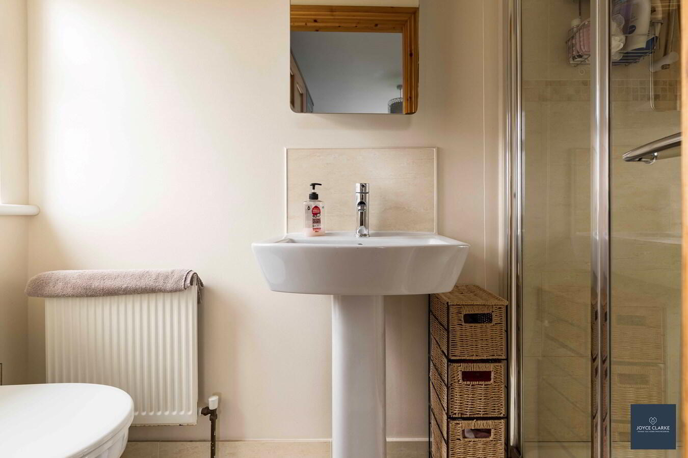 Shower enclosure with Triton electric shower. Pedestal style sink with mixer tap. Back to wall dual flush WC. Heated towel rail. Tiled floor and part tiled walls. Window. Extractor