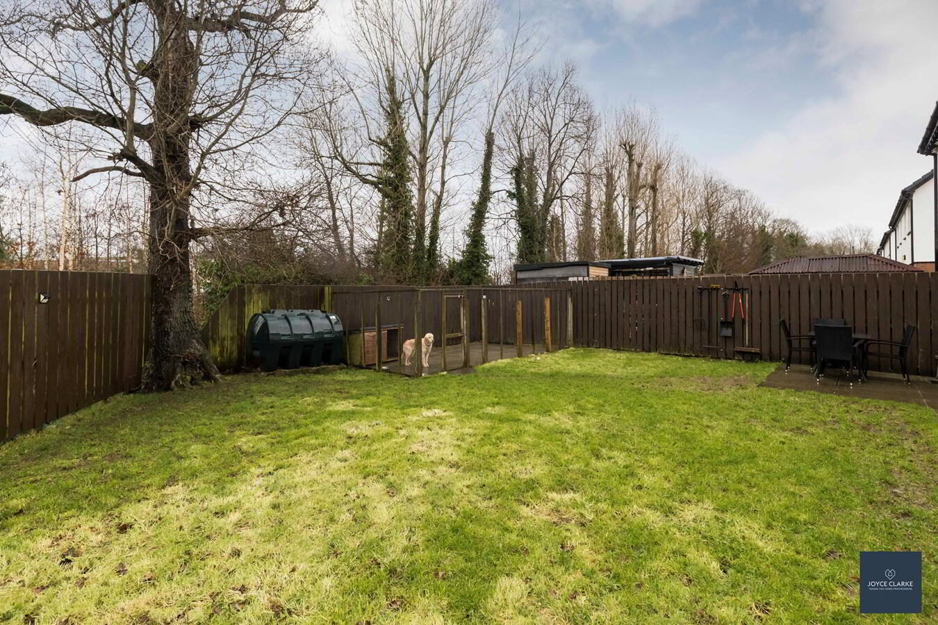 Large corner plot with fully enclosed garden to the rear laid in lawn. Paved patio area. Outside tap. Dog run. Access gate to driveway.