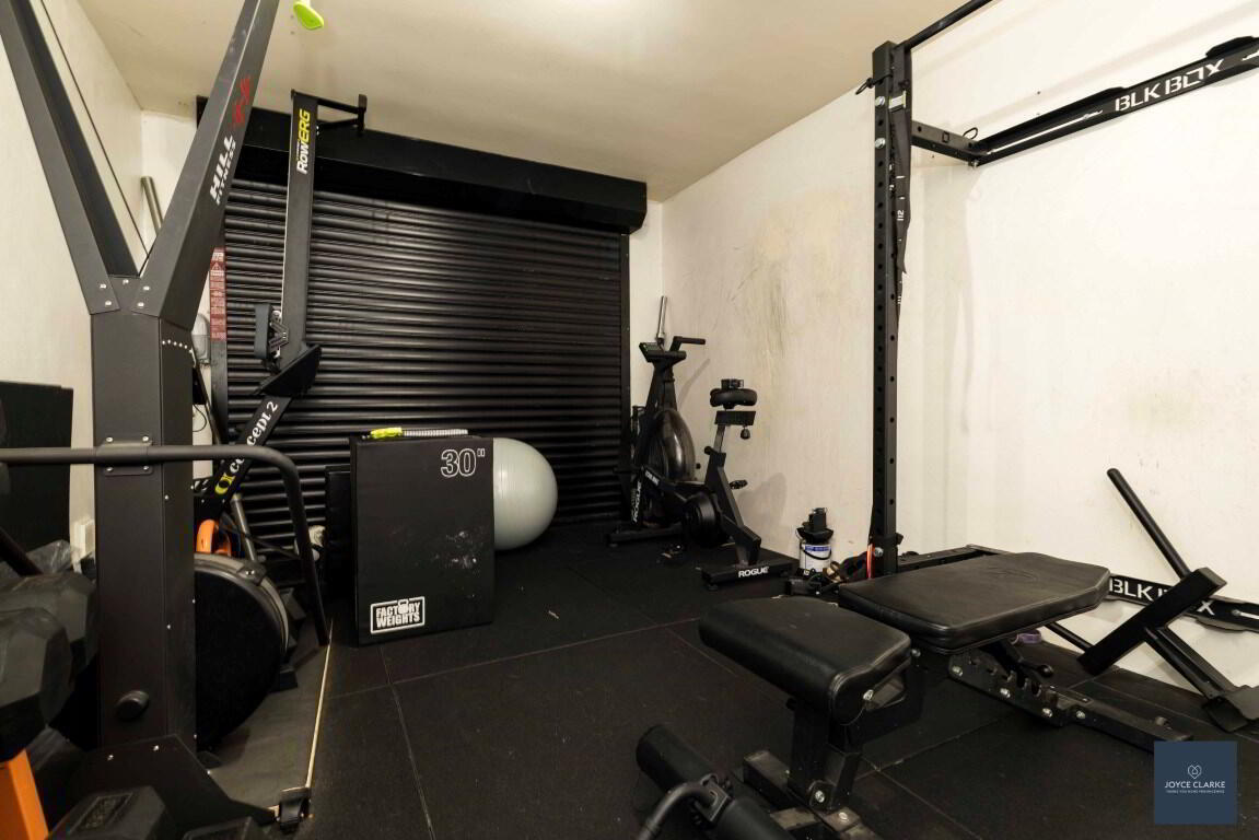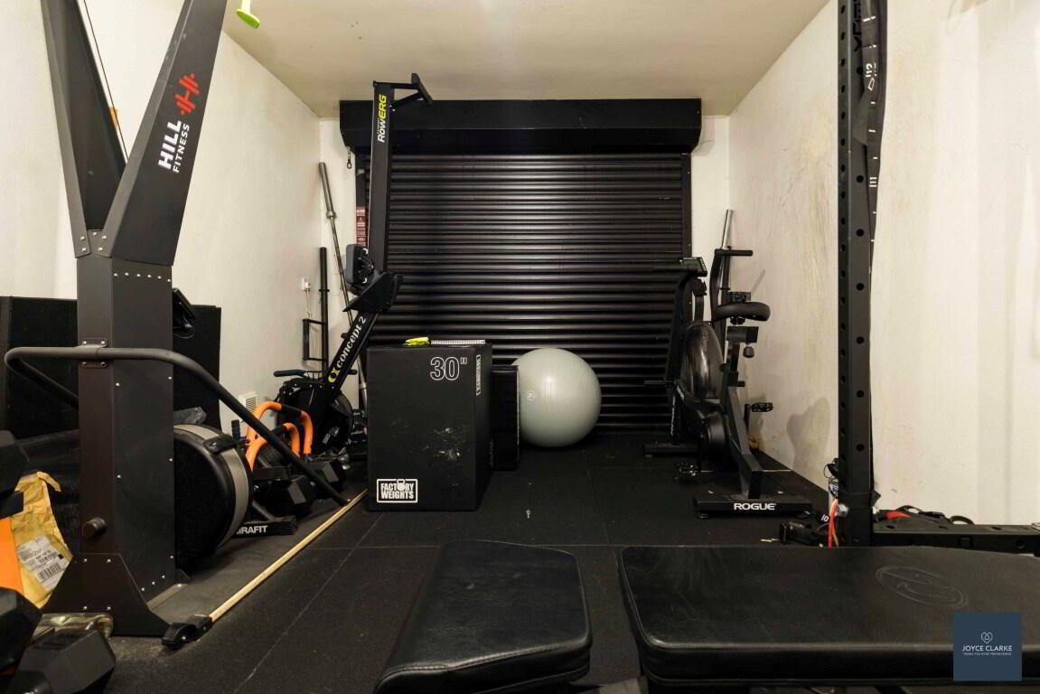 Roller garage door to front. Pedestrian door giving access to entrance hall. Lighting and power points. Oil fired burner. Storage closet with water tank.