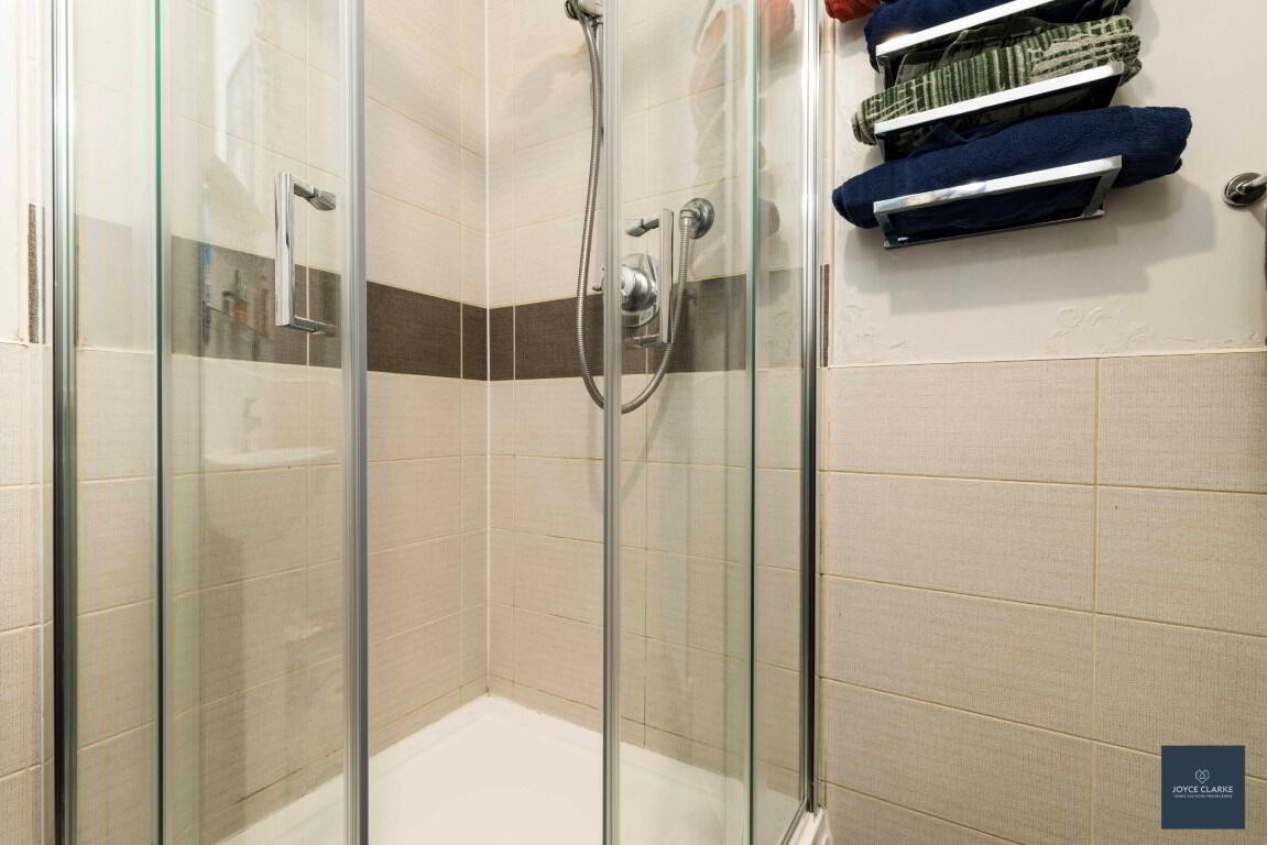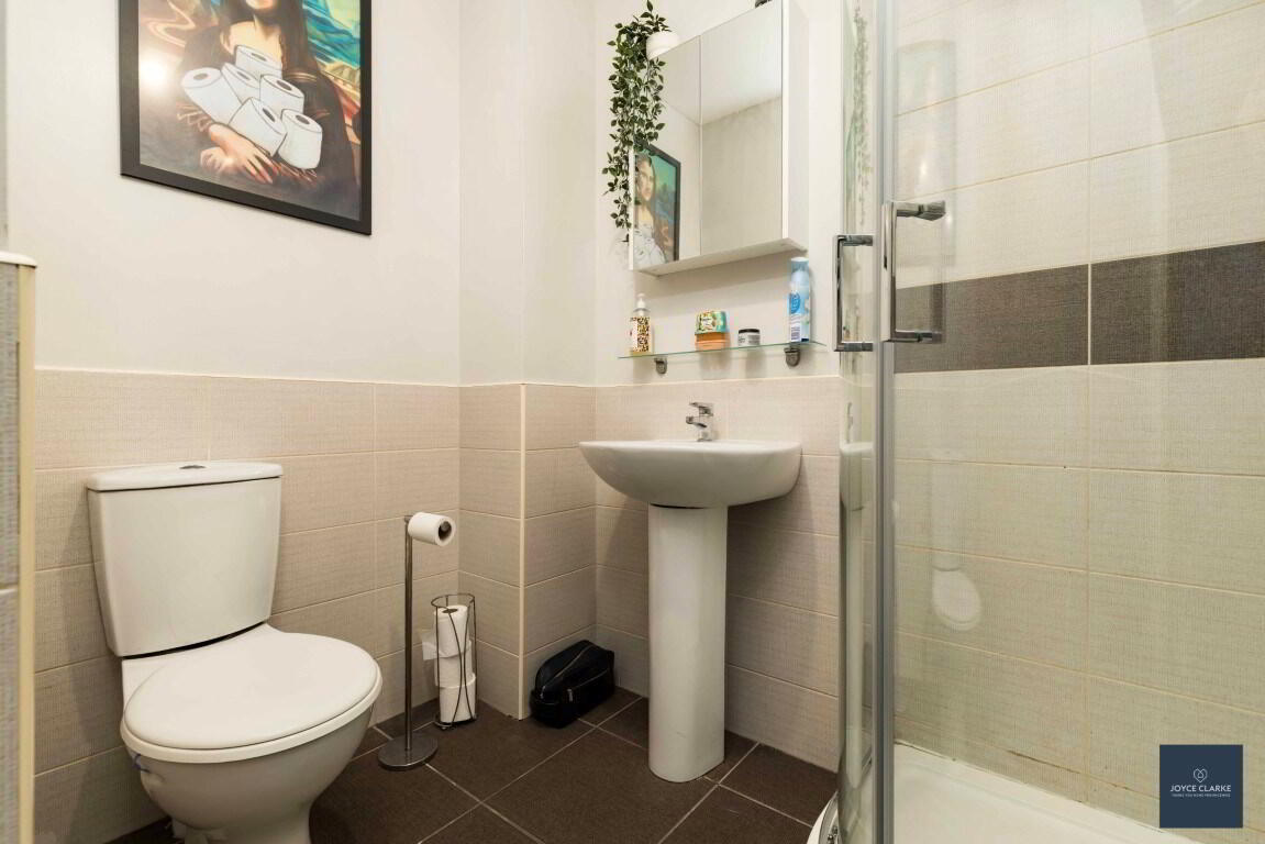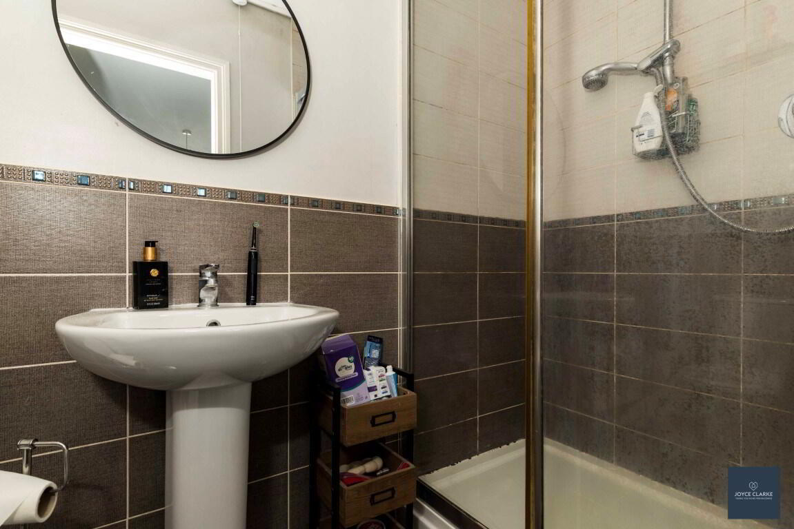 Tiled shower enclosure with mains fed shower. Dual flush WC and wash hand basin with pedestal. Tiled flooring and half tiled walls. Single panel radiator. Extractor fan.