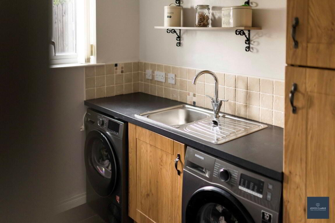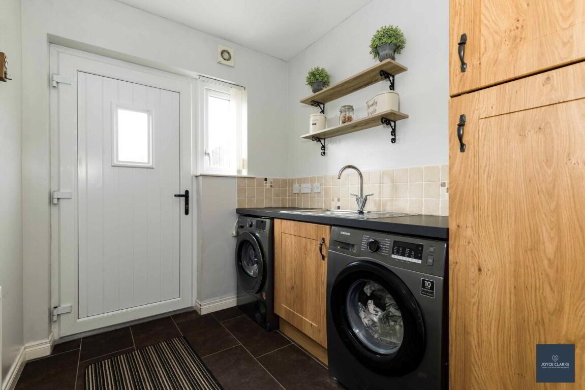 Low level units with additional larder style unit. Stainless steel sink and drainage unit. Space for washing machine and tumble dryer. Tiled flooring and splashback. Single panel radiator. Extractor fan. UPVC door with glazed panel giving access to rear garden