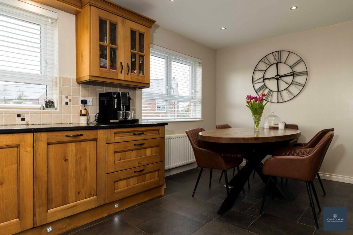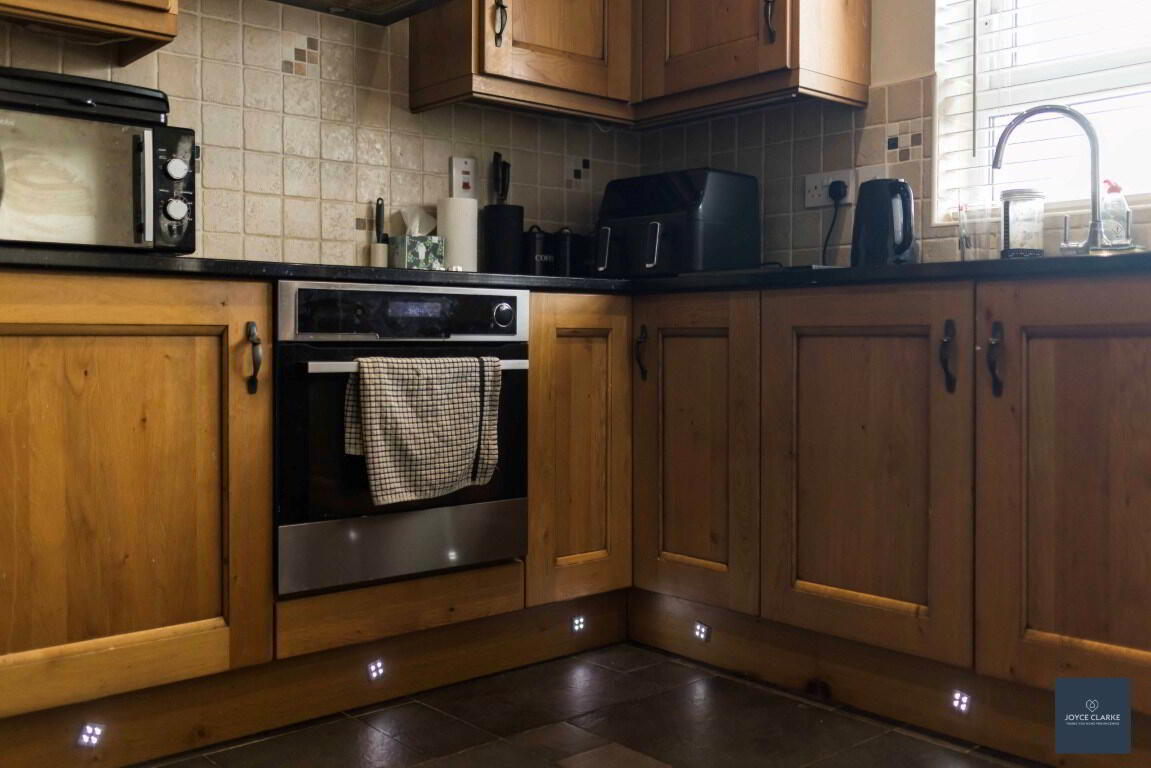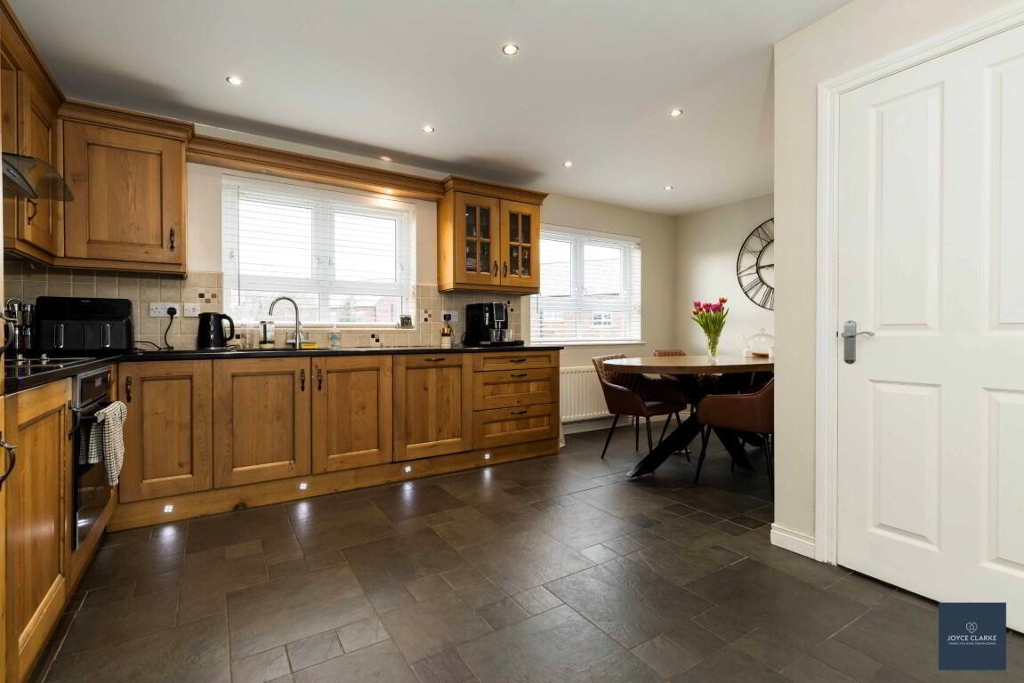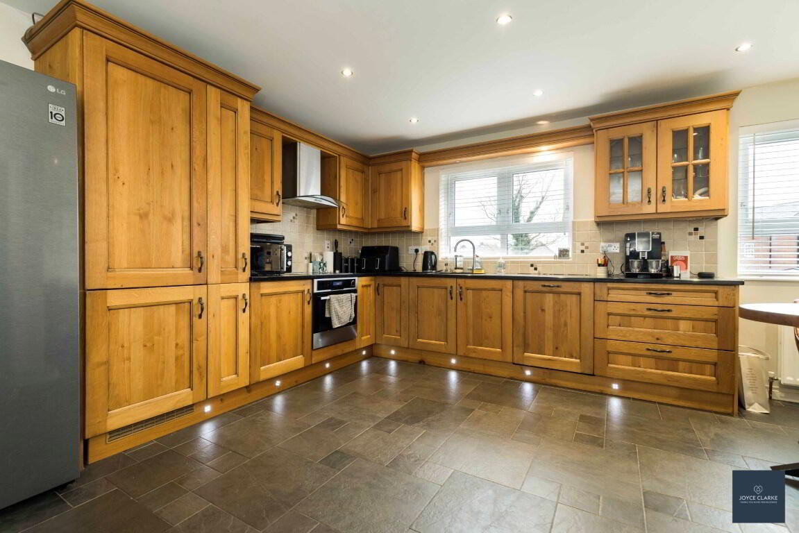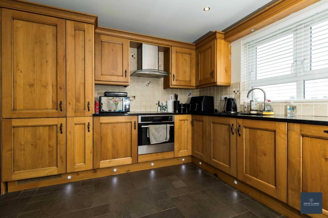 Excellent range of high and low kitchen cabinets including granite worktops, solid wood doors and larder style units. Range of appliances include electric oven, four ring electric hob with extractor fan with glass canopy above and integrated dishwasher. Underfitted one and half bowl stainless steel sink. Tiled flooring and splashback. Kickboard lighting. Double and single panel radiators. Recessed lighting to kitchen area.