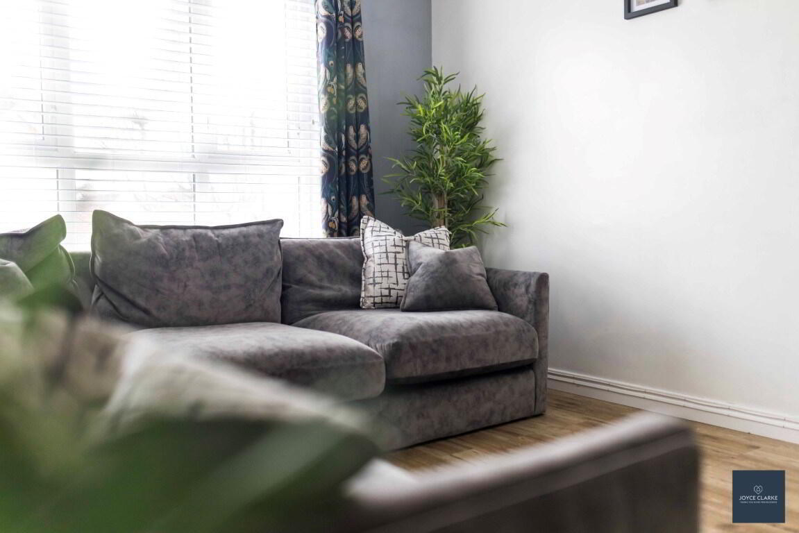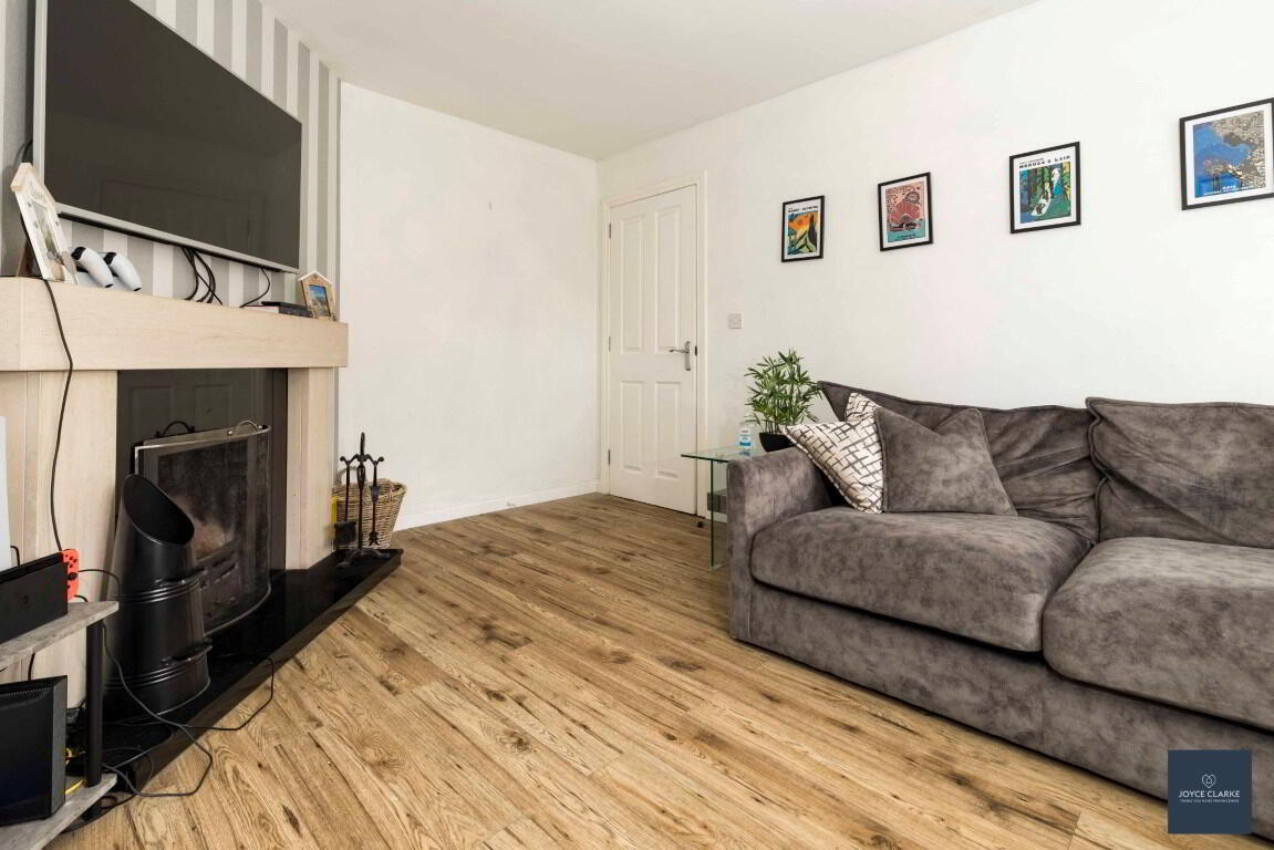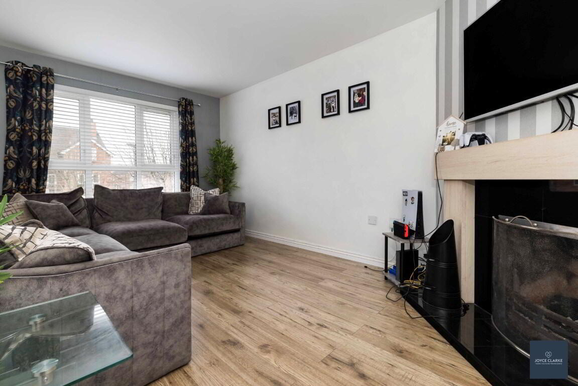 Front aspect reception room including feature open fireplace with stone surround and granite hearth. TV point for wall mounted TV. Wood effect laminate flooring. Double panel radiator.