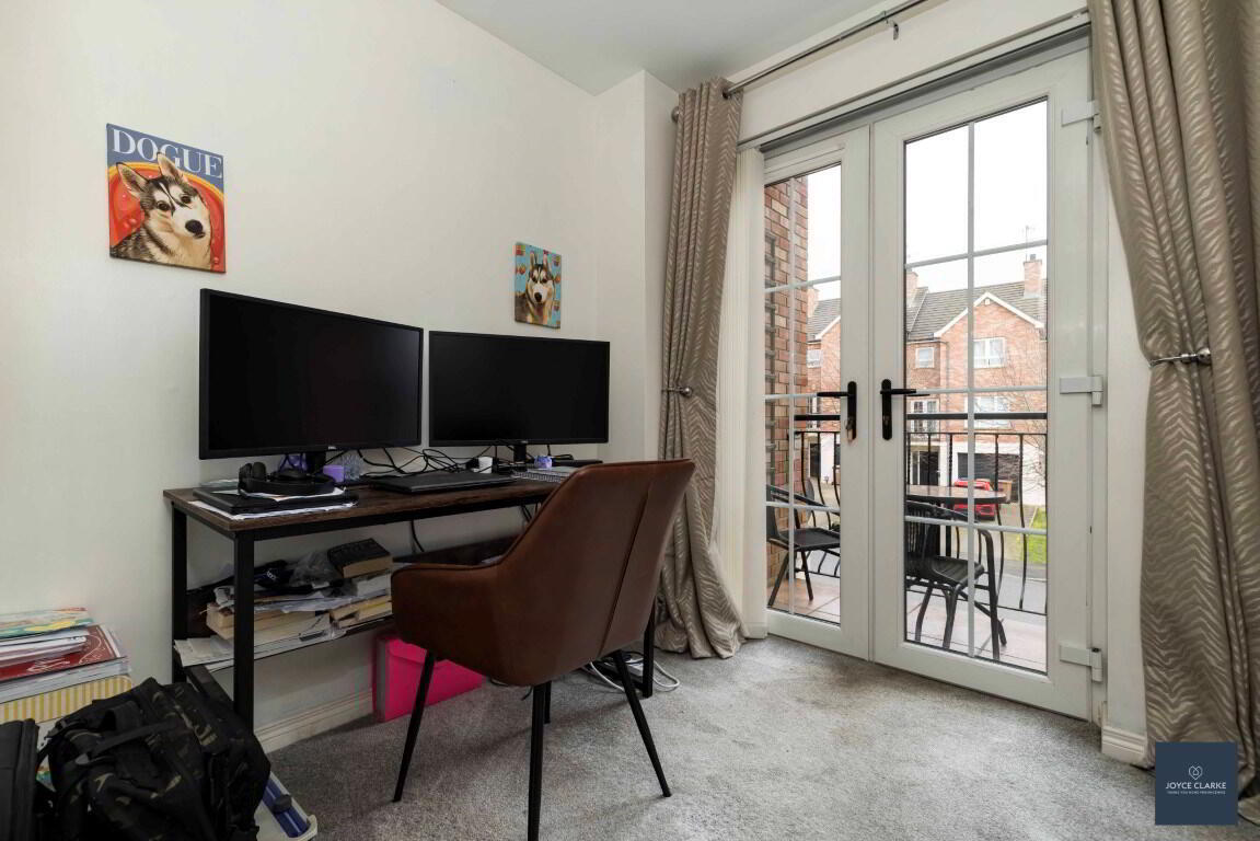 Double patio doors leading to balcony. Single panel radiator. Telephone point.