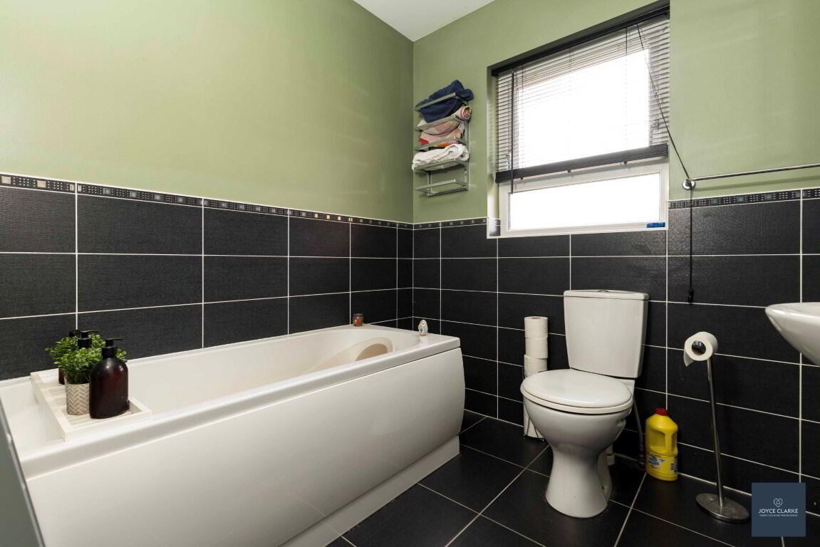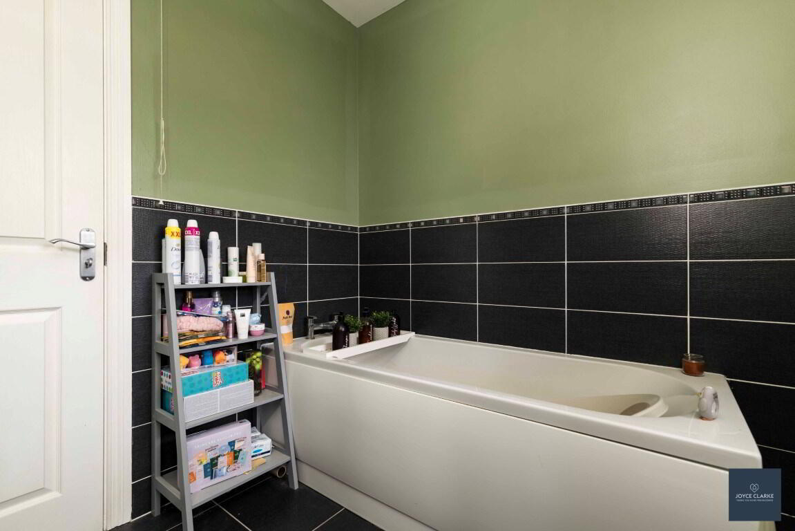 Three piece bathroom suite comprising of panel bath, dual flush WC and wash hand basin with pedestal. Single panel radiator. Tiled flooring and half tiled walls. Single panel radiator. Extractor fan.