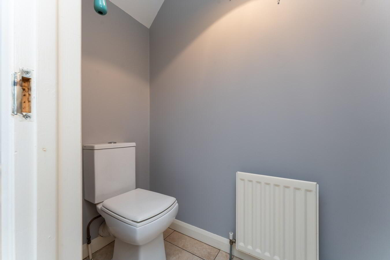 Dual flush WC and wash hand basin with pedestal. Tiled flooring and splashback. Single panel radiator. Extractor fan.
