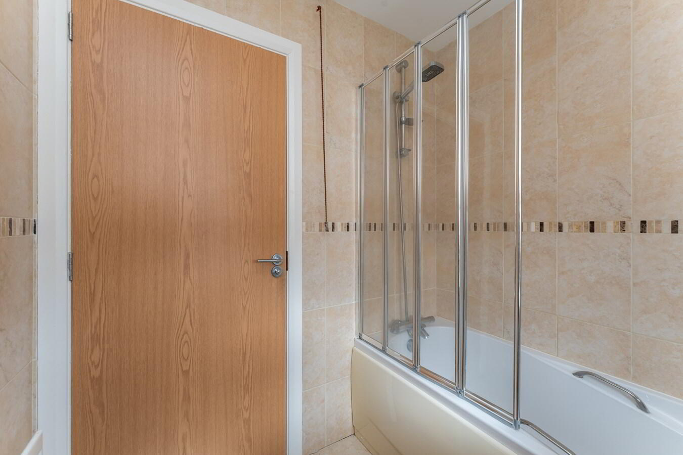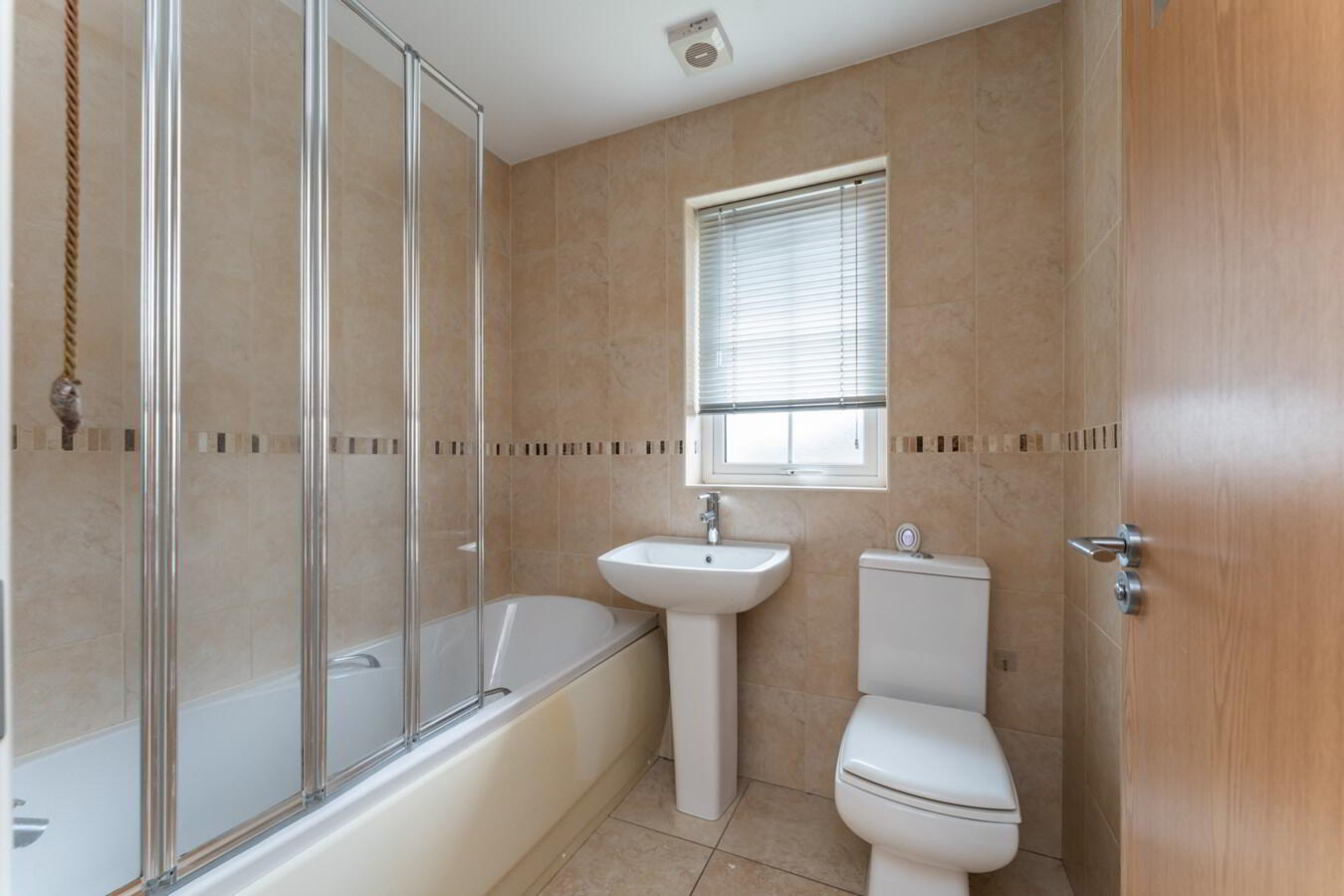 Fully tiled family bathroom comprising panel bath with shower head attachment and shower screen above, dual flush WC and wash hand basin with pedestal. Single panel radiator. Extractor fan.