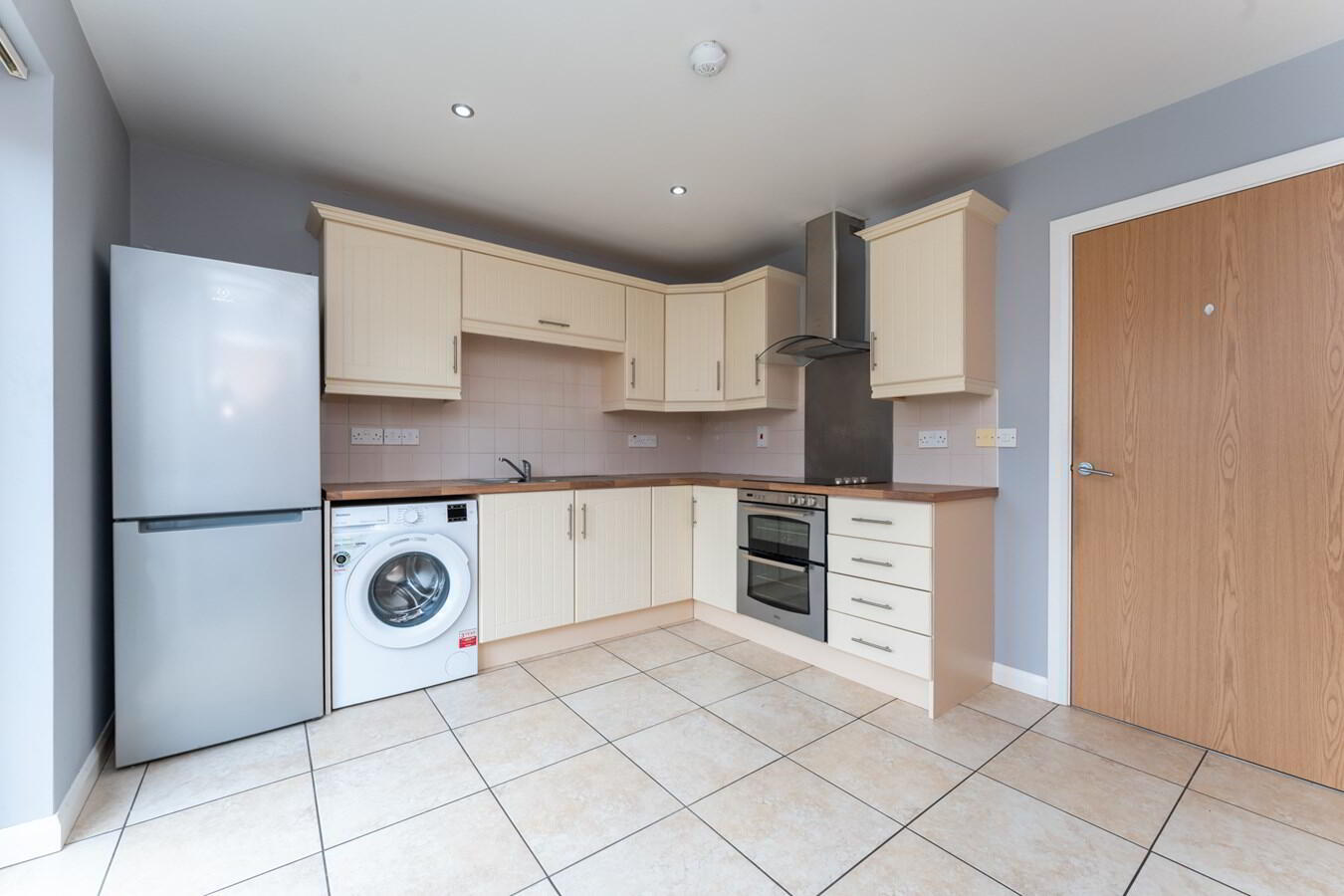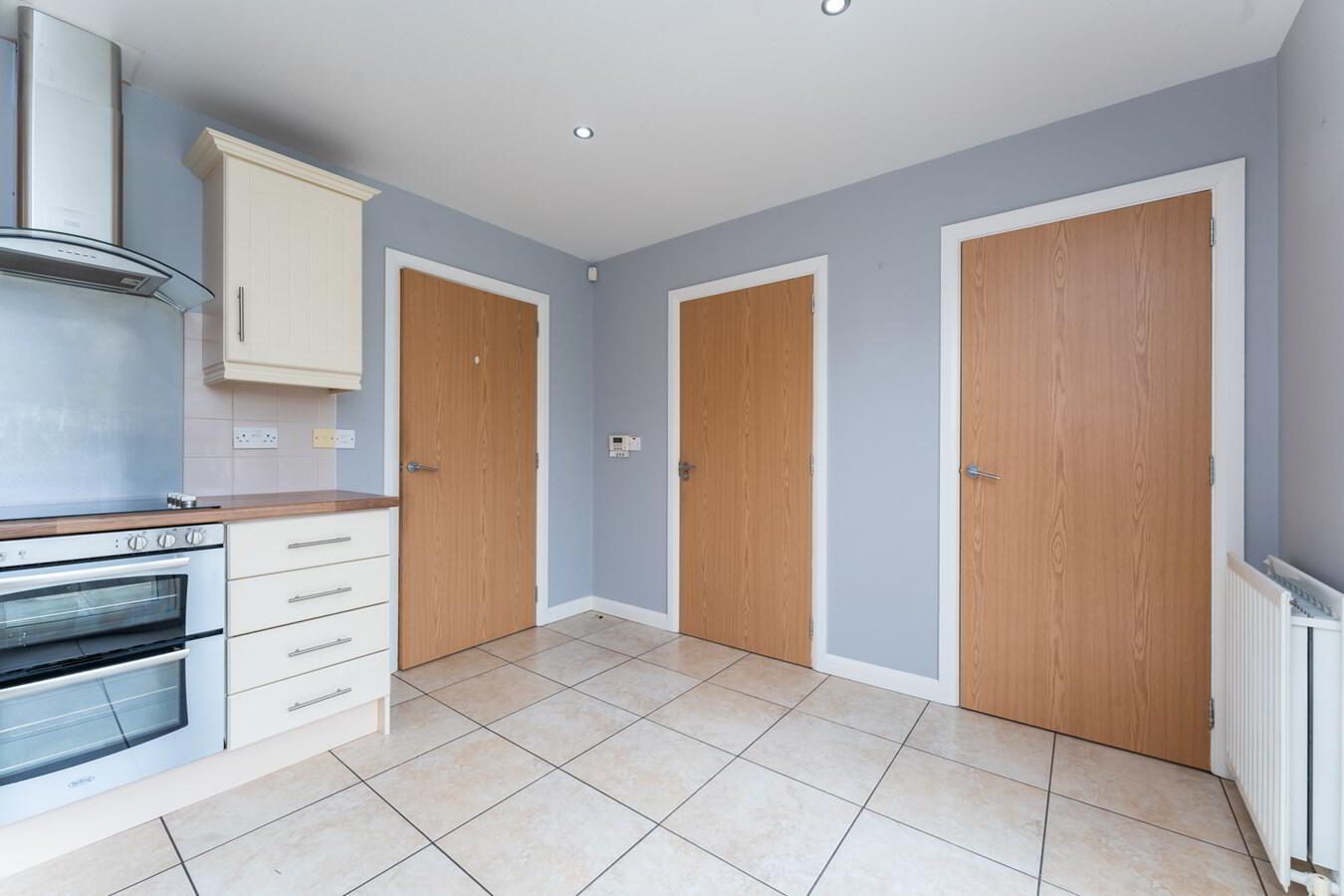 Range of high and low level kitchen cabinets. Appliances include double oven four ring electric hob with glass canopy extractor fan above and stainless steel splashback behind. Space for washing machine and fridge freezer. Stainless steel one and half bowl sink and drainage unit. Tiled flooring and splashback. Double UPVC framed patio doors leading to rear garden. Recessed lighting. Double panel radiator. Walk-in storage closet.