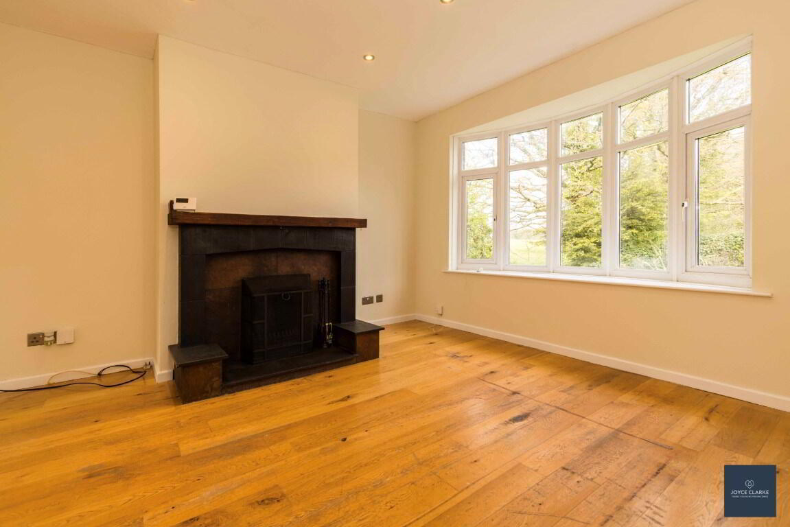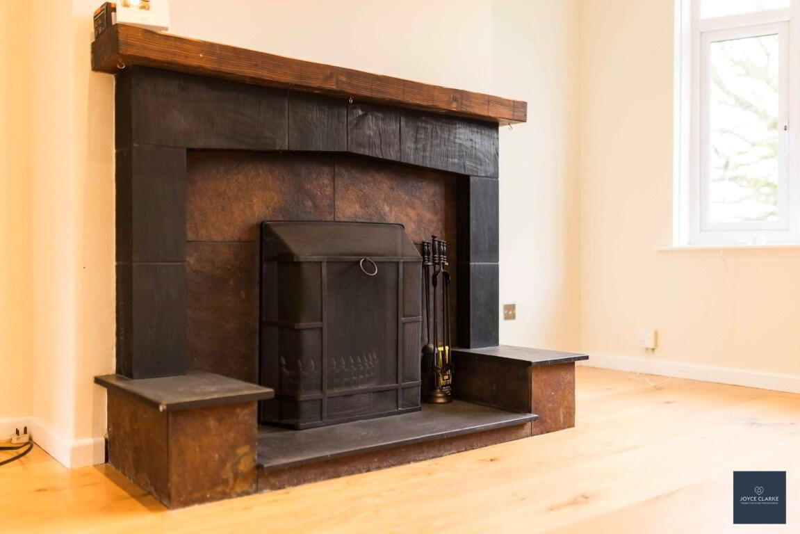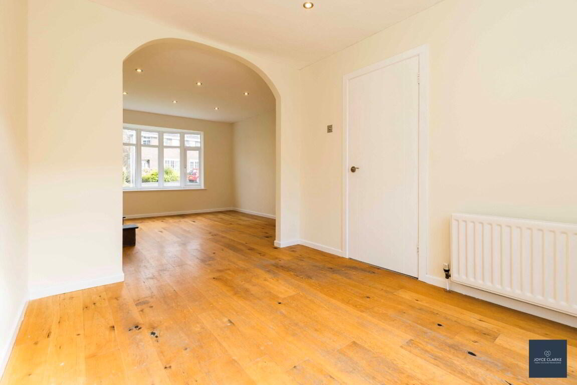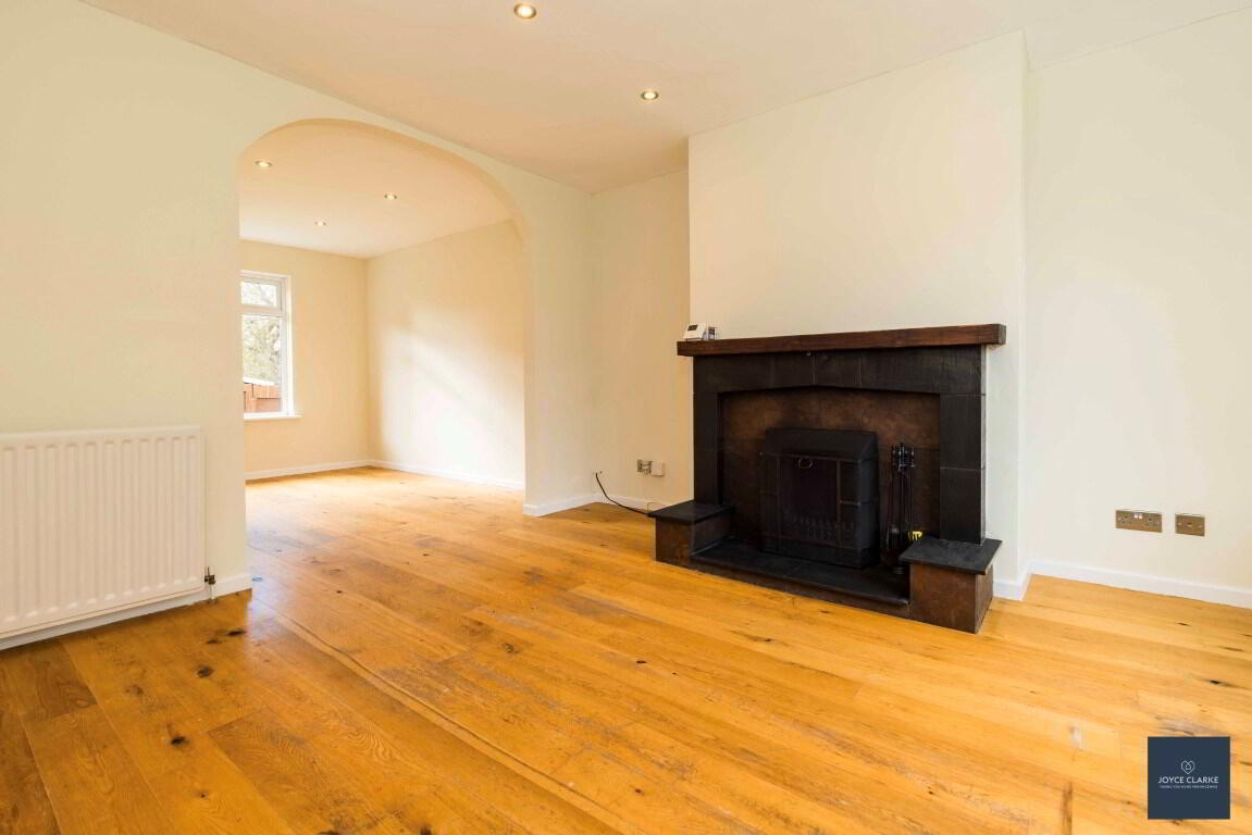 Front aspect reception room with attractive bay window. Feature fireplace with tiled surround and hearth, beam mantel. Double panel radiator. Recessed lighting. Wooden flooring. TV point. Hallway leading to dining room.