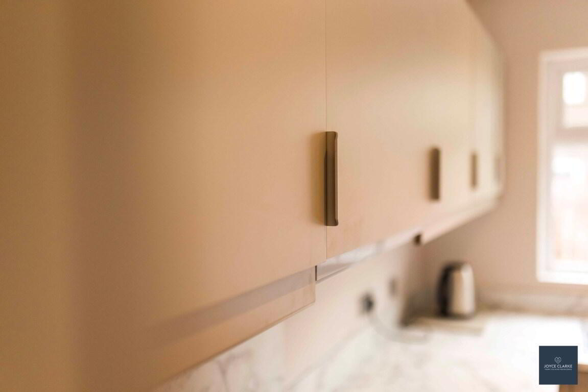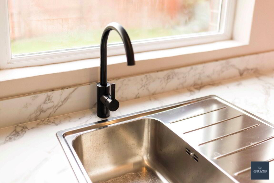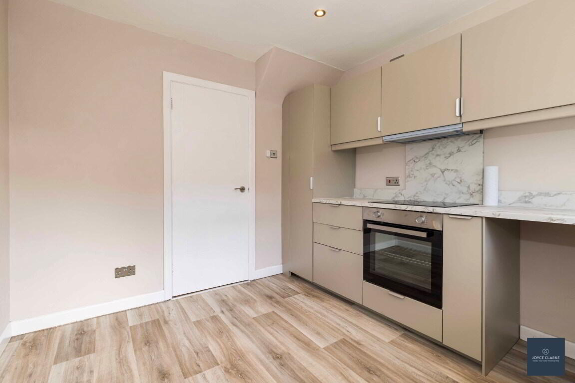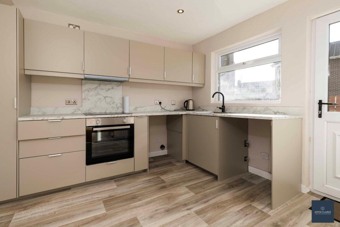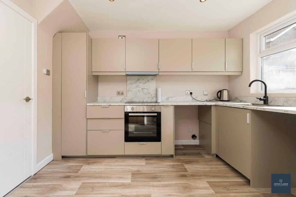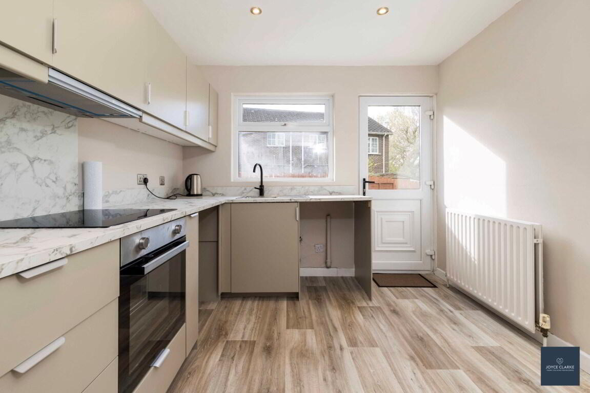 Brand new kitchen with range of high and low level storage units with soft close drawers. Integrated oven, four ring ceramic hob with extractor over. Stainless steel sink with drainer with mixer tap. Space for fridge and washing machine. Double panel radiator. Laminate flooring. Recessed lighting. Part glazed uPVC door to rear garden