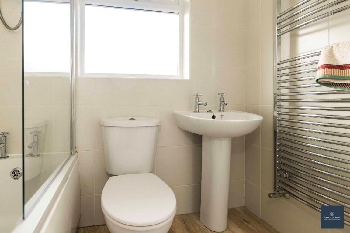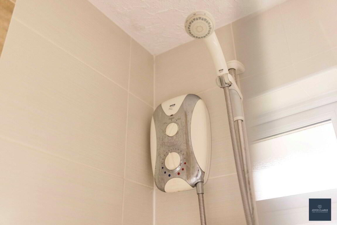Fully tiled bathroom comprising of three piece suite to include moulded bath with MIRA Play electric shower over. WC. Pedestal style sink. Heated towel rail. Hotpress.