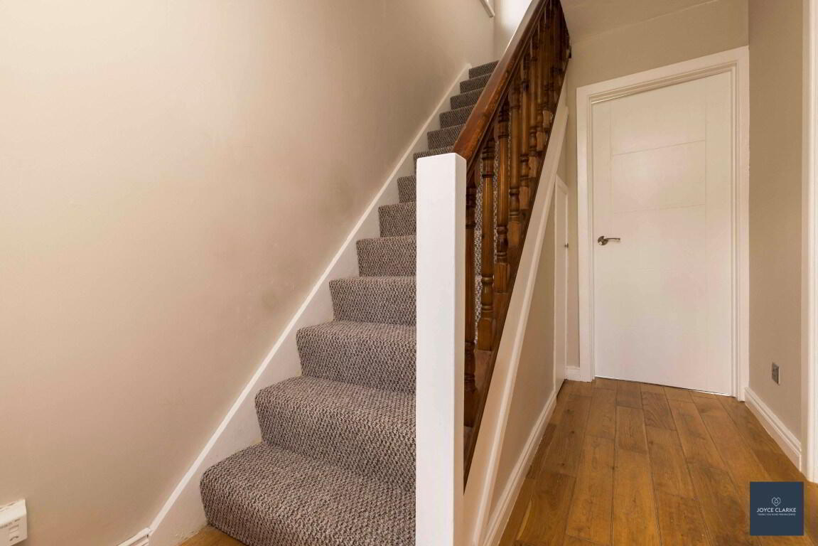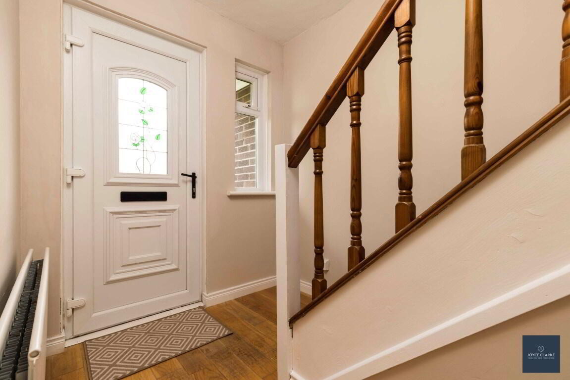 ENTRANCE DOORuPVC entrance door with ornate centre glazed panel leading to hallway. Double panel radiator. Wooden flooring. Storage cupboard.