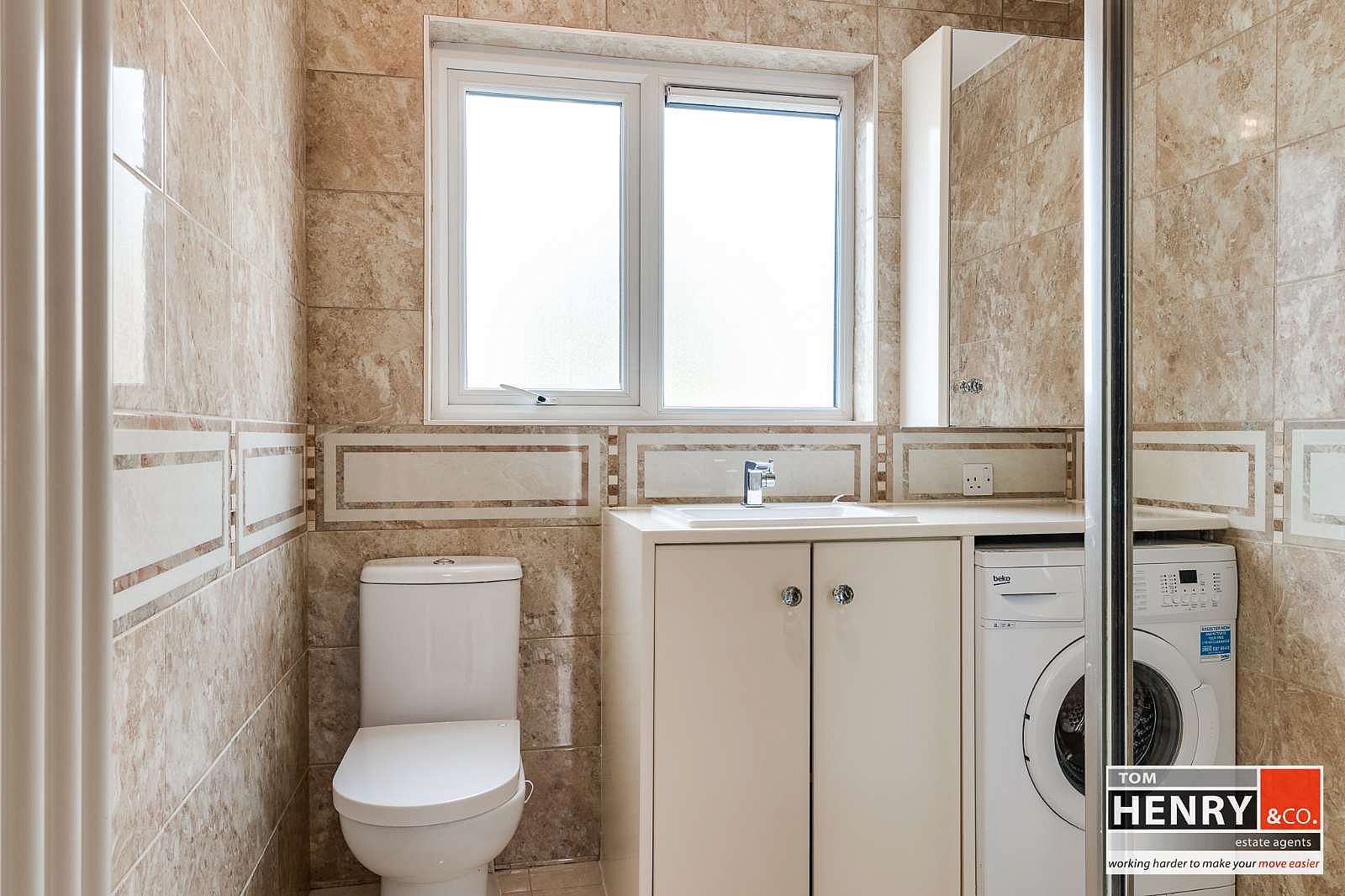 WASH HAND BASIN WITH MIXER TAP FITTING IN UTILITY UNIT. PLUMBED FOR A.W.M. TOILET. SHOWER. TILED WALLS. TILED FLOOR.