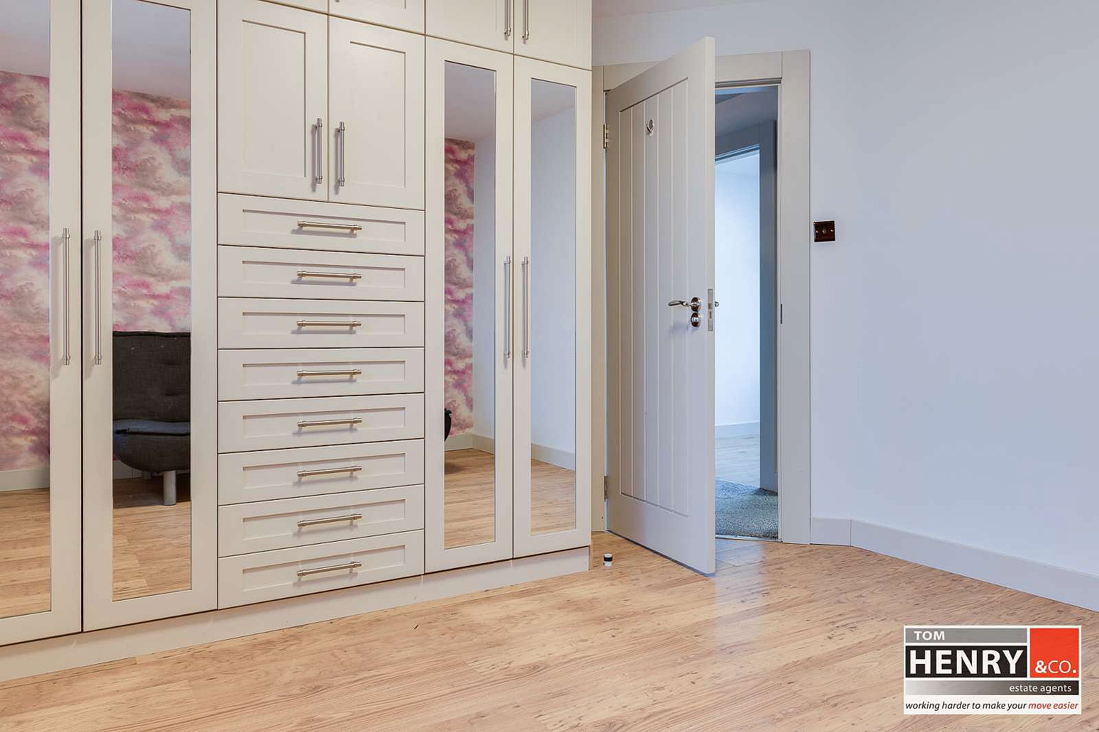 TO FRONT. FITTED WARDROBE WITH SHELVED, DRAWER & HANGING SPACE. PRE-FINISHED FLOOR.