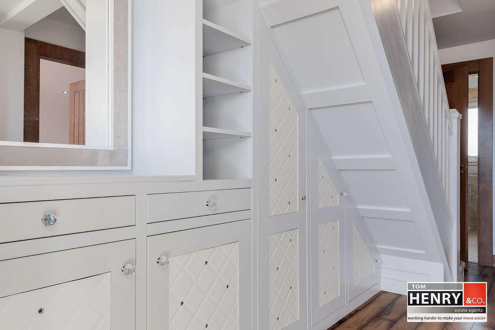 COMPOSITE EXTERNAL DOOR WITH FROSTED GLASS PANEL. PRE-FINISHED FLOOR. INTEGRATED UNDER STAIR UNIT WITH DRAWER, SHELVED & CUPBOARD STORAGE. CARPET TO STAIRS TO FIRST FLOOR.