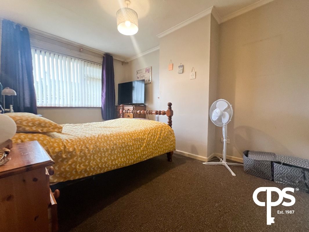 Spacious double bedroom with carpet flooring and numerous electrical sockets within.