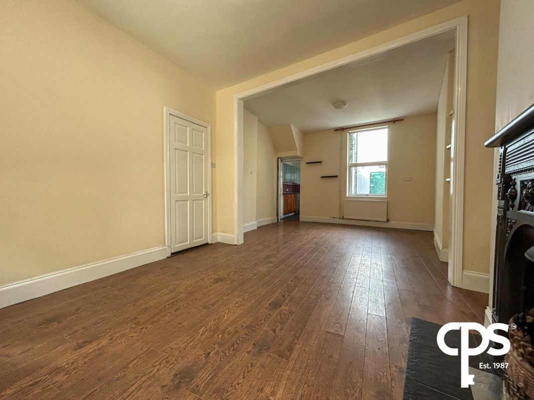 The spacious reception room comes with solid wooden flooring throughout and currently houses an open fireplace.