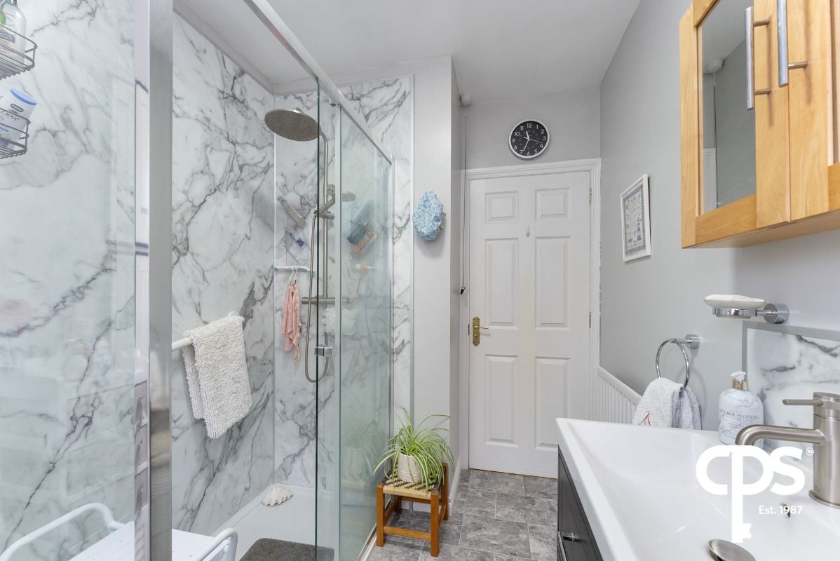 Bathroom – 2.3m x 1.8m Tiled throughout, Double shower, Vanity Unit,