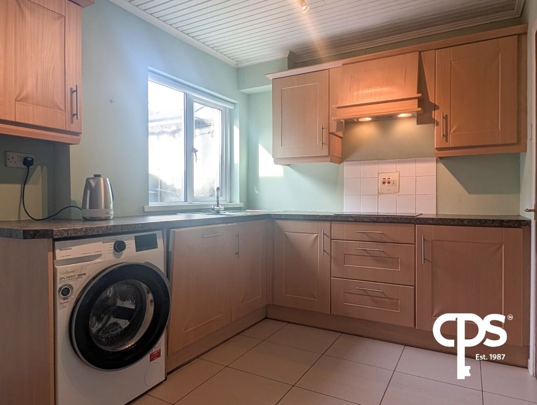 Fitted kitchen with a range of high and low level units in a light wood finish. Comprising tiled flooring, stainless steel sink, integrated Hotpoint hob and double oven as well as integrated dishwasher and fridge freezer. Space provided for washing machine. Rear door access to enclosed yard .