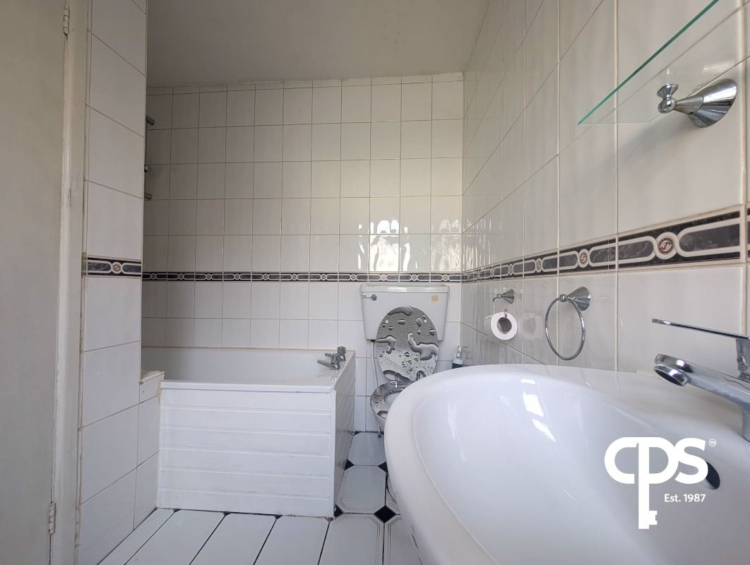 Fully tiled family bathroom with white suite including bath with Mira shower overhead, WC and wash hand basin. Double panel radiator.