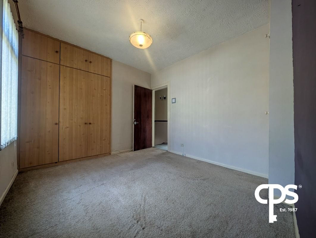 Spacious front-facing bedroom with carpet flooring, built-in wardrobe, hot press and single panel radiator.