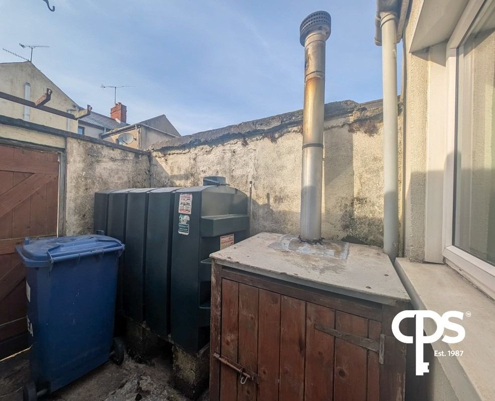 Enclosed rear yard with oil tank and boiler, offering a low-maintenance outdoor space.