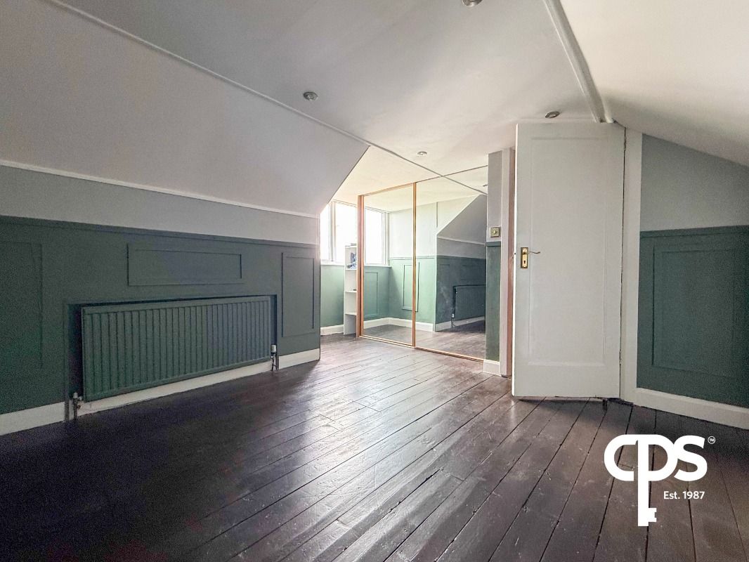 Another well-proportioned bedroom featuring wooden flooring, built-in storage and half panelled walls.