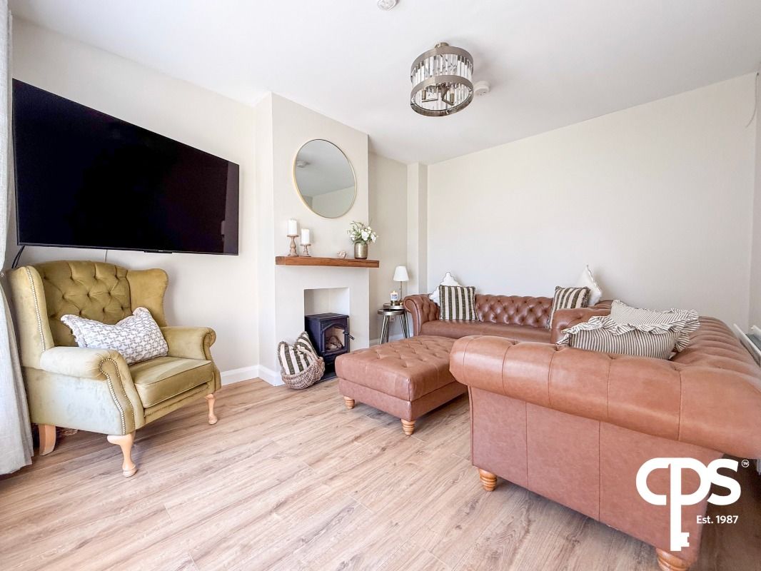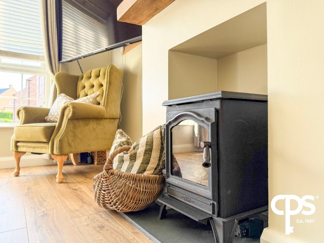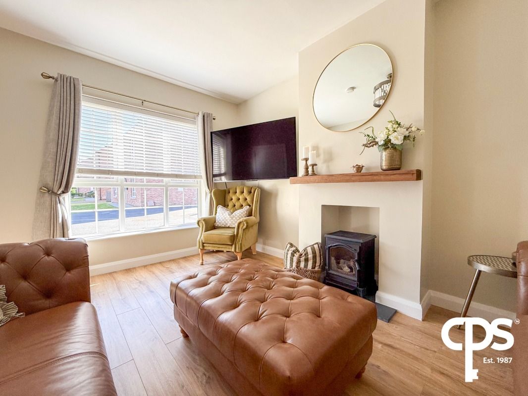 A bright, front-facing reception room finished with laminate wood-effect flooring. An ornamental stove with faux beam mantle provides a charming focal point.