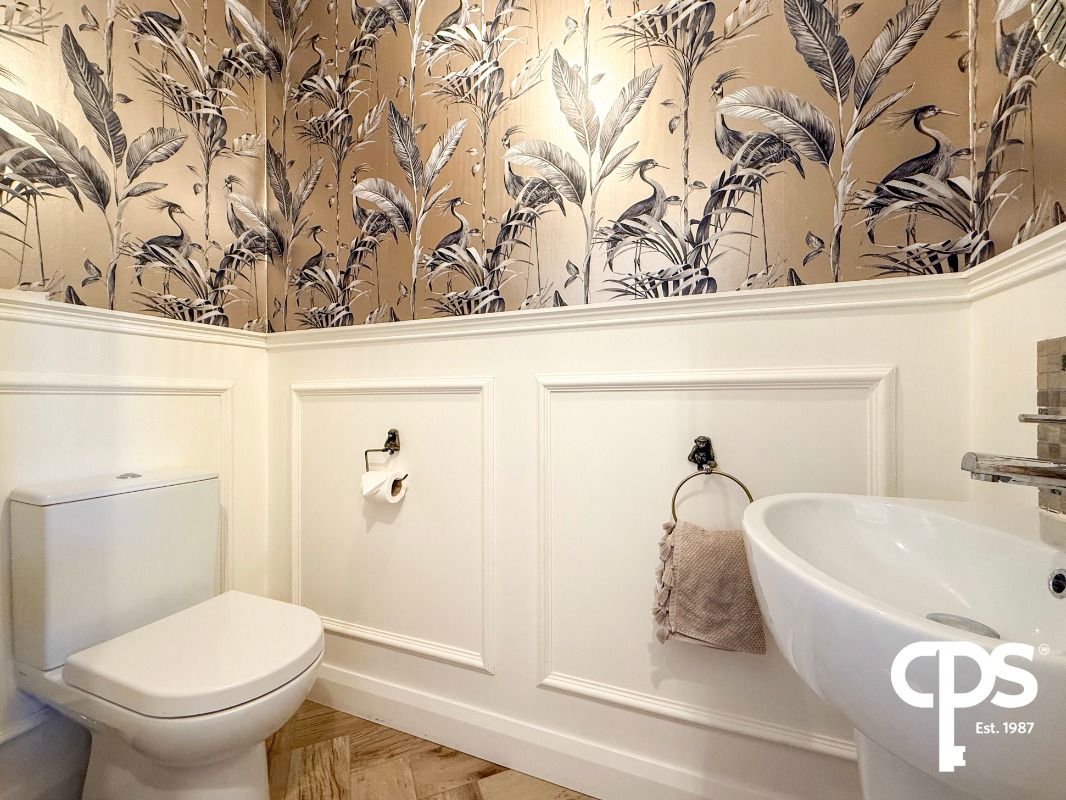 Comprising a W/C and wash hand basin. Beautifully finished with wall panelling and designer wallpaper.