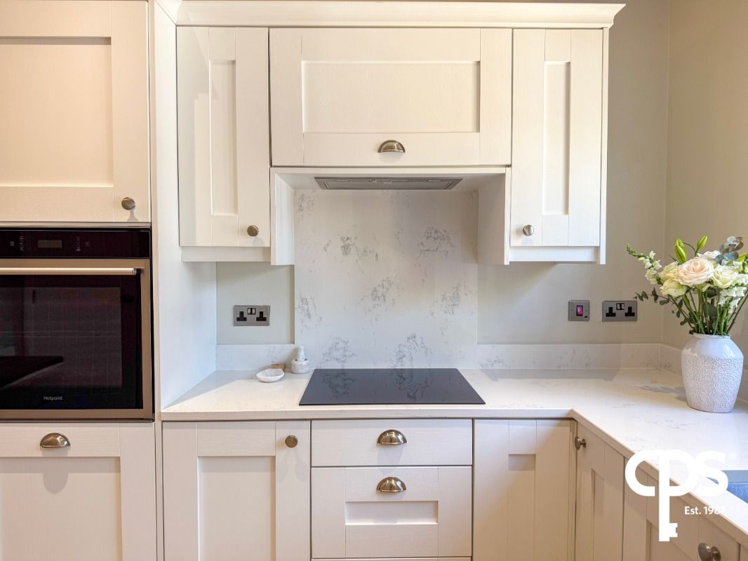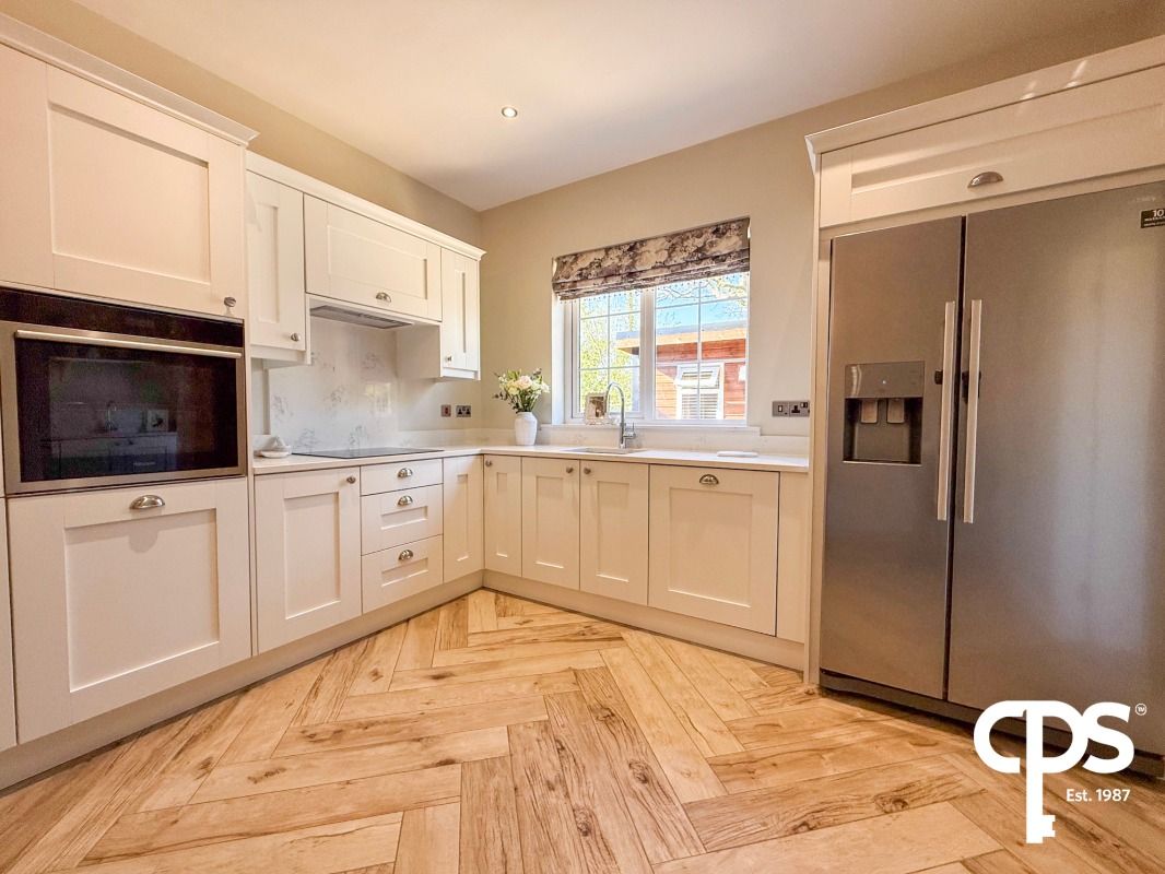 A recently installed shaker-style kitchen with high and low units, complemented by upgraded quartz worktops. Features include a Quooker hot tap, AEG hob and oven, and space for an American-style fridge freezer.