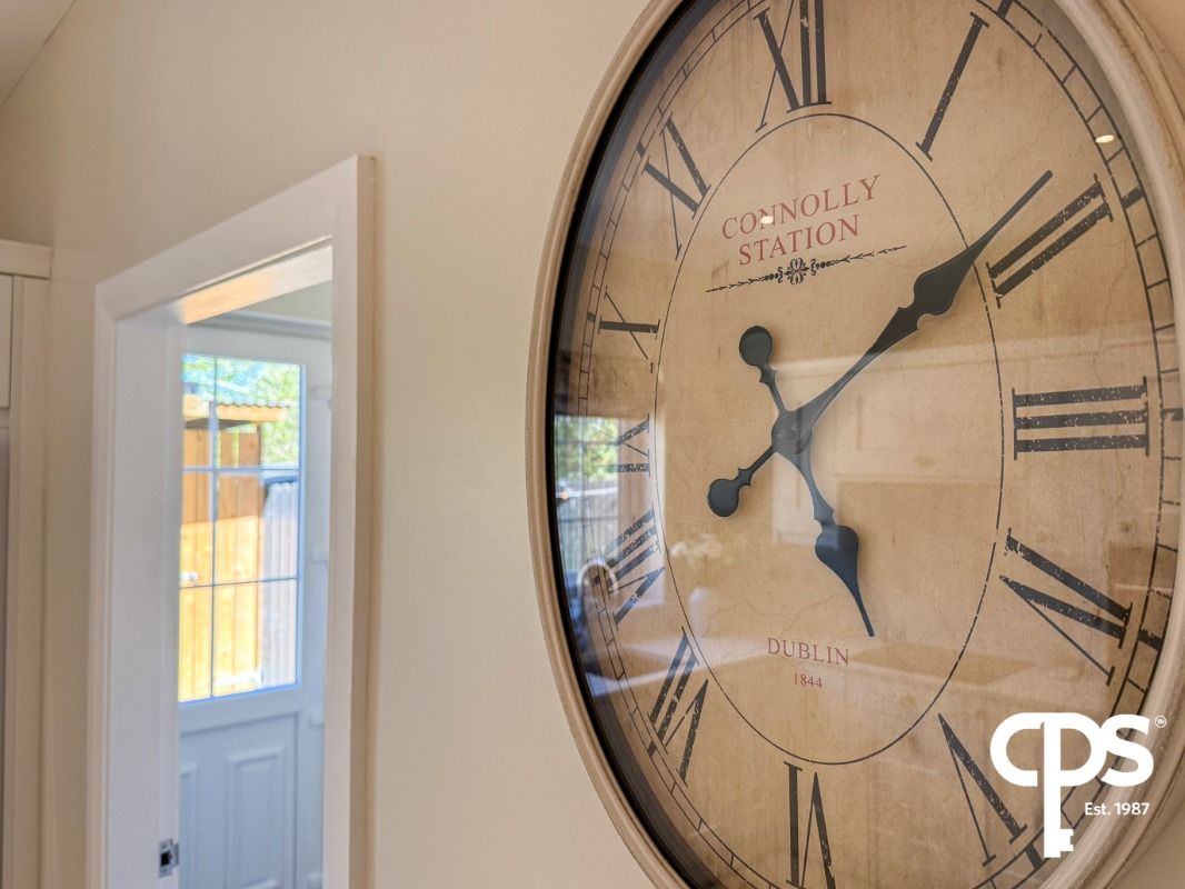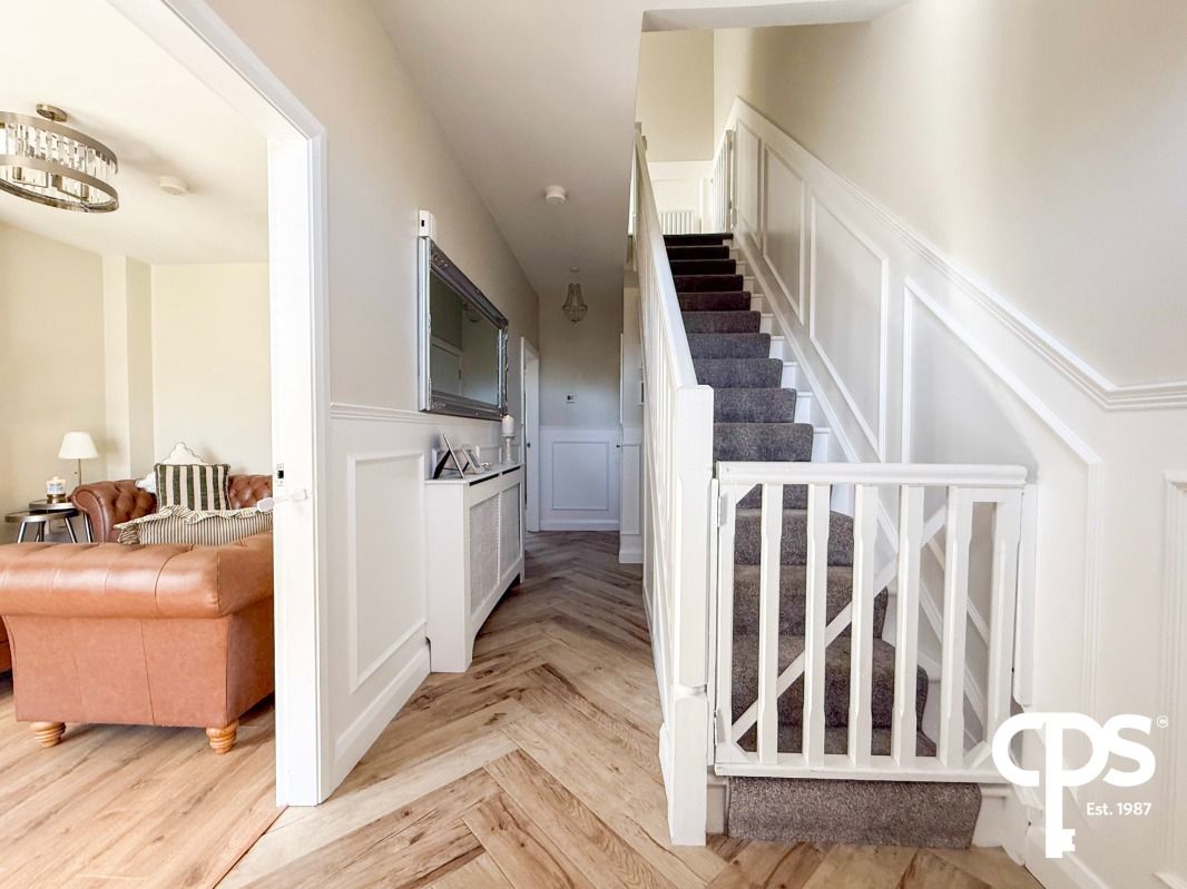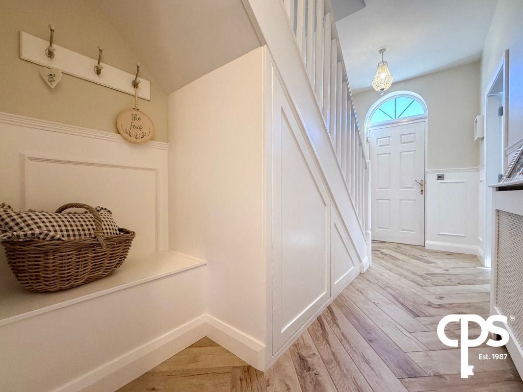 A welcoming entrance featuring custom-built understairs storage, snug area and decorative wall panelling. Newly tiled flooring.